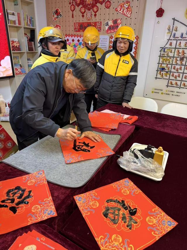 活动最后,大家一起挥毫泼墨,书写福字、对联,拓印红扇。红纸黑字间,流淌着浓浓的年味与温情。骑手也积极参与,体验传统文化的魅力,感受社区大家庭的温暖。