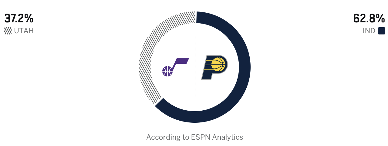 ESPN预测爵士vs步行者:爵士胜率37.2%,步行者胜率62.8%