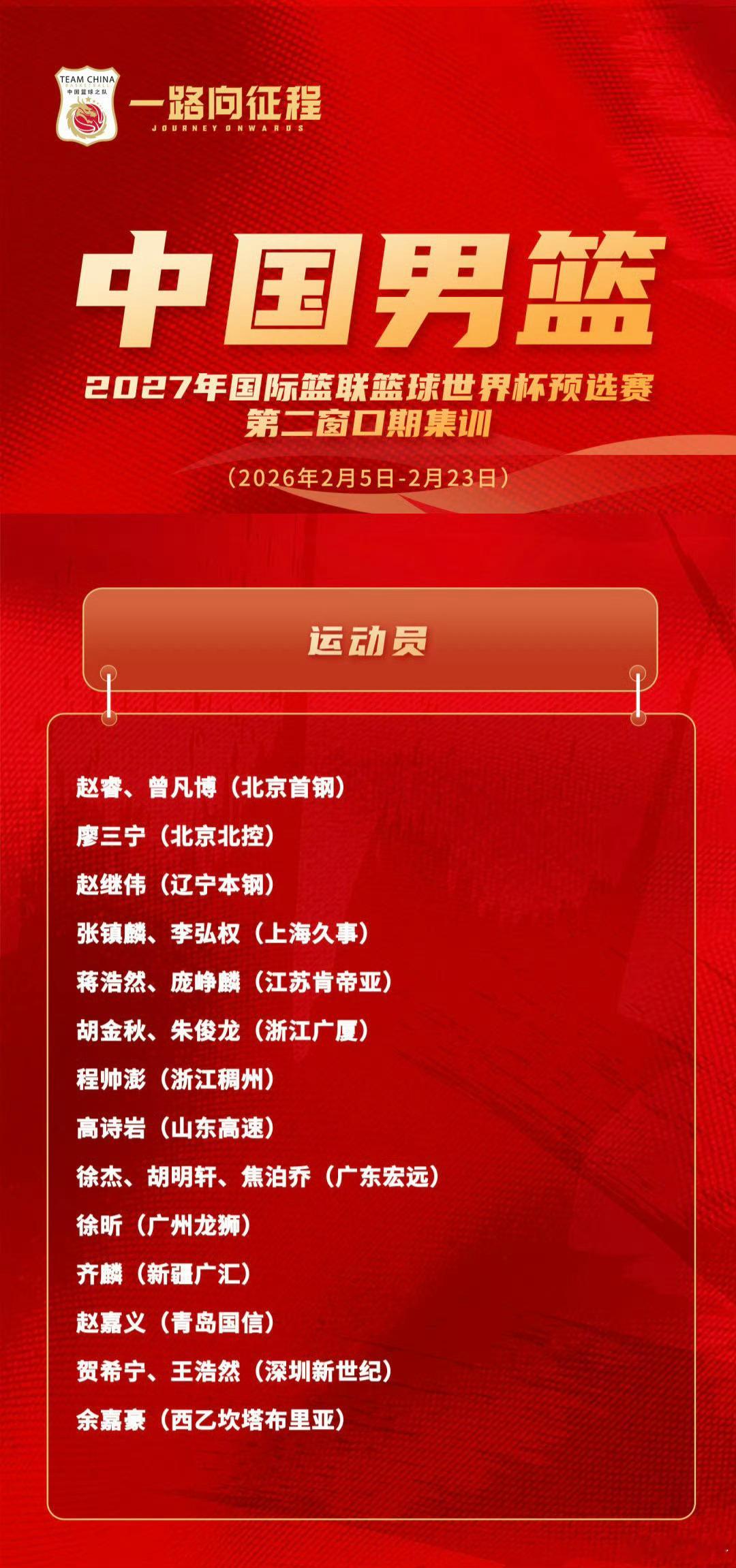 公布2027FIBA世界杯 亚大区预选赛第二窗口期集训名单具体名单⬇️中国队将在