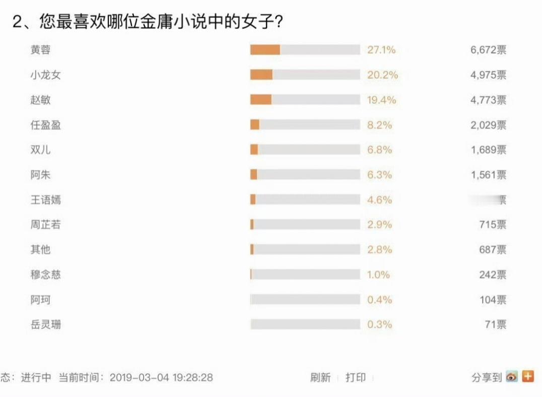 这是19年的投票金书男角:萧峰>杨过>令狐冲>郭靖>韦小宝>张无忌(难以理解张无忌比韦小宝还低一点)金书女角:黄蓉>小龙女>赵敏>任盈盈>双儿>阿朱>王语嫣>周芷若(芷若确实不高诶)