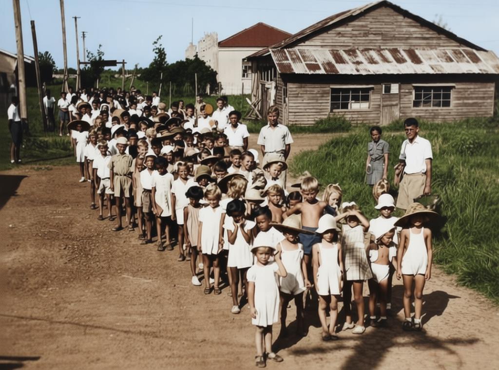 1941年珍珠港事件后,日军占领上海公共租界,将英、美、加等国的6000多名在华侨民关进龙华等集中营。这些孩子大多是在上海出生的侨民后代,原本生活在租界的国际化社区,战争让他们一夜之间沦为囚徒。 照片里孩子们穿着单薄的夏装,排成长长的队伍,背景是简陋的木板房集中营建筑,周围杂草丛生。他们排队的场景可能是领取食物、取水或参加集合,这些孩子失去了正常的童年生活,在饥饿、疫病与恐惧中度过了数年时光。