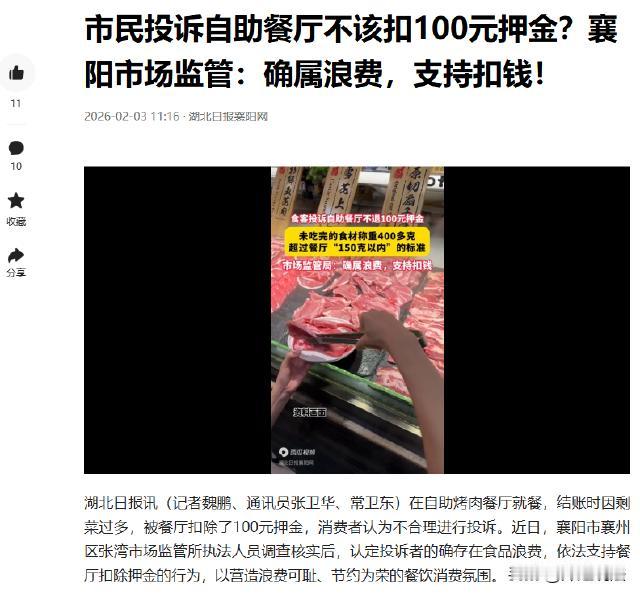 湖北襄阳,刘女士和3个朋友去自助餐厅吃饭,交了336元含100元押金。服务员提醒用餐限时两小时、浪费别超150克,否则押金不退。刘女士等人满口答应,可拿食物时随心所欲。用餐结束剩8份食物,结账时店家扣除100元押金。刘女士觉得不合理,投诉到12315,执法人员到现场,发现剩食物400多克,超标近三倍。 1月25号那天中午,刘女士,拉着三个朋友就奔自助餐厅去了。 到店之后,几个人交了336块,这里面还包含100块押金,服务员赶紧过来提醒,说用餐限时俩小时,可别浪费食物,要是浪费超过150克,这100块押金可就不退啦。 刘女士她们当时答应得那叫一个痛快,可一进餐厅,看到那琳琅满目的美食,刘女士她们就把服务员的提醒全抛到九霄云外去了。 啥好吃拿啥,也不管自己能不能吃完,就跟不要钱似的,拿食物那叫一个随心所欲。 几个人敞开了肚皮吃,没一会就撑得不行了,再一看桌上,好家伙,还剩下8份食物,这要是让服务员看见了,押金指定得扣,可刘女士她们也没当回事,想着大不了就扣呗。 到了结账的时候,店家一称剩下的食物,直接就把那100块押金给扣了,刘女士当时就不乐意了,觉得自己被刁难了,她心里琢磨着,不就是剩了点食物嘛,至于扣我押金吗?这店家也太不讲道理了。 刘女士一拍桌子,直接就投诉到12315去了,她觉得自己有理,肯定能讨回个公道。 很快,执法人员就赶到现场了,店家把剩下的食物端出来,执法人员一称,好家伙,400多克,超标都快三倍了。 这结果一出来,刘女士当时就傻眼了,脸唰地一下就红了。 原来,这《反食品浪费法》有规定,商家对于浪费明显的消费者,是可以收取厨余垃圾处理费的。刘女士她们浪费这么多,店家扣押金那完全是合理合法的。 依据反食品浪费法第七条,餐饮服务经营者可对造成明显浪费的消费者收取处理厨余垃圾的相应费用。 商家事先明确告知浪费超150克不退押金,这属于双方约定的合同条款,刘女士等人同意即视为合同成立,用餐后剩400多克食物,远超约定标准,商家扣除押金,实为履行合同中的违约责任条款,合理合法。 刘女士投诉,本是想争取自身权益,却因忽视规则而被打脸,她们对反食品浪费意识太淡薄了。 不过,也有人觉得店家押金制度是否合理合法存在争议,押金数额是否过高,是否有变相强制消费之嫌。 店家也挺委屈,说他们设置押金制度,也是为了提醒大家节约粮食,现在粮食多珍贵,不能这么随便浪费。而且他们也提前提醒了刘女士她们,是她们自己没当回事。 执法人员也跟刘女士解释,说店家的做法没问题,既维护了自身的权益,又响应了节约粮食的号召。 刘女士这下算是彻底没话说了,她这才意识到,自己为了那点面子投诉,结果被打脸打得啪啪响。 粮食从种植到收获,再到加工成我们餐桌上的美食,这中间得经过多少道工序,耗费多少人力、物力和财力。每一粒粮食都来之不易,都凝聚着农民的辛勤汗水。有什么理由去浪费呢? 而且,在一些贫困地区,孩子们连一顿饱饭都吃不上,他们最大的愿望就是能有一顿丰盛的饭菜。 而我们,却在自助餐厅里肆意浪费食物,这对比起来,多让人痛心。 刘女士这事,也算是给她自己和大家都上了一课,以后再去自助餐厅吃饭,可不能再这么任性了,得根据自己的食量来拿食物,能吃多少拿多少,千万别贪多。 店家也可以多做一些宣传和引导工作,可以在餐厅里张贴一些节约粮食的标语,或者在顾客拿食物的时候,提醒他们适量取餐,这样既能减少食物的浪费,又能提升餐厅的形象。 节约粮食是每个人的责任和义务,不能因为生活条件好了,就忘记了粮食的来之不易,只有大家都行动起来,从自身做起,从小事做起,才能让节约粮食成为一种习惯。 您对这件事有什么看法呢?是觉得商家做法无可厚非,还是认为消费者权益也应得到更多保障?