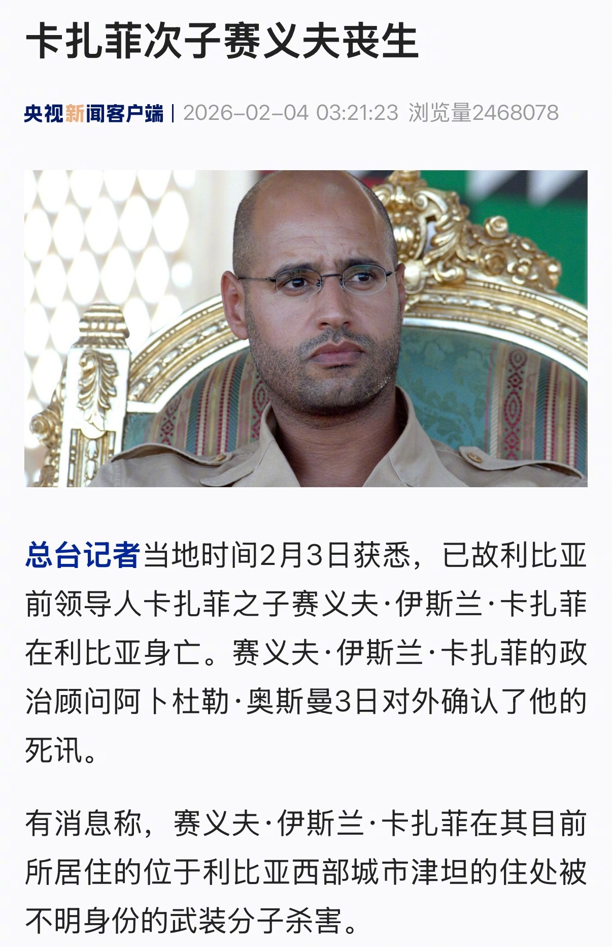 #卡扎菲次子丧生#【#卡扎菲次子在住处被武装分子杀害#】#卡扎菲次子一度被视为接班人#总台记者当地时间2月3日获悉,已故利比亚前领导人卡扎菲之子赛义夫·伊斯兰·卡扎菲在利比亚身亡。赛义夫·伊斯兰·卡扎菲的政治顾问阿卜杜勒·奥斯曼3日对外确认了他的死讯。
