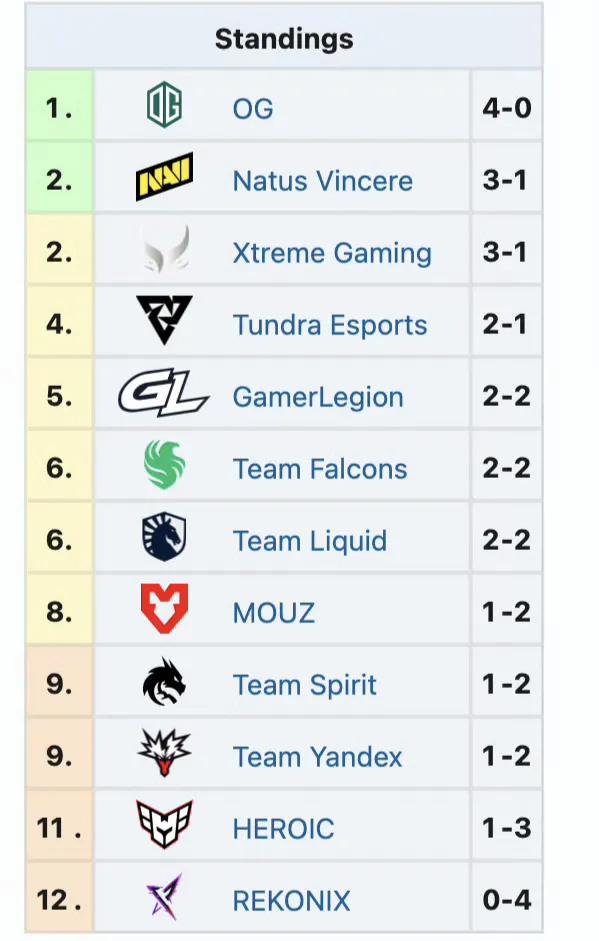 Blast 6小组赛一天赛果,XG三胜一负 第一天对手从纸面实力看总体会比较弱,比较轻松拿下两个对手,另外两局都是劣势很大,只是Yandex打的更好,没有给XG任何机会。Heroic战队比较变态,大优的情况犯病被翻盘,算是捡到的一分。 目前还是OG全胜排第一,XG暂列第二。 第二天对手看上去会比较强,OG Spirit Liquid Falcons。