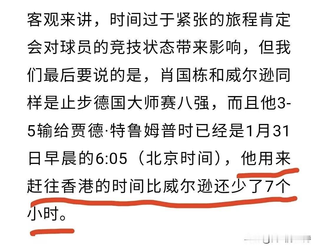 囧哥威尔逊香港大奖赛首轮2-5不敌肖国栋,吐槽世台联赛事安排不合理。 这一次没有谈球杆的问题,吐槽的是赛程问题。 本来凯伦威尔逊是安排在今天比赛,但是由于特鲁姆普和墨菲进入上一站比赛——德国大师赛决赛,临时调整了凯伦威尔逊和塞尔比的赛程,导致休息时间少了一天。 去年玉山公开赛和香港大奖赛也是背靠背进行,但是都是一个时区,适应还相对容易,这一次从德国飞香港,还有时差的问题,导致凯伦发挥不理想落败。 世台联回应说,由于为了球员的奖金,赛事多了,导致排名前列的球员确实打得比赛变多了。他们尽量协调。 其实赢凯伦的肖国栋,在德国大师赛也是进了8强,来香港的时间还比凯伦少了7个小时,还是看适应能力吧。 凯伦威尔逊被淘汰,损失巨大,由于本赛季凯伦只拿了两个邀请赛的冠军,排名赛一个冠军都没有,后面的球员锦标赛和巡回锦标赛两个红包赛要参加就很难了。