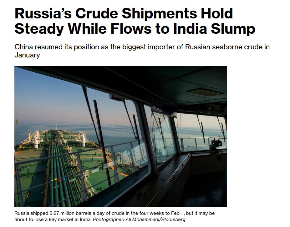 彭博社报道,尽管面临越来越大的压力,俄罗斯原油出口仍保持基本稳定,截至2月1日的四周内,日均出口量为327万桶。