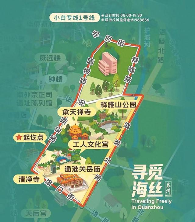 “小白”专线1号线线路走向:文化宫—南俊路—学府路—崇福路—东街—温陵路—涂门街—百源路—文化宫(单向开行)。运营时间为8:00—19:30,平均6—7分钟一班,一票制2元/人。
