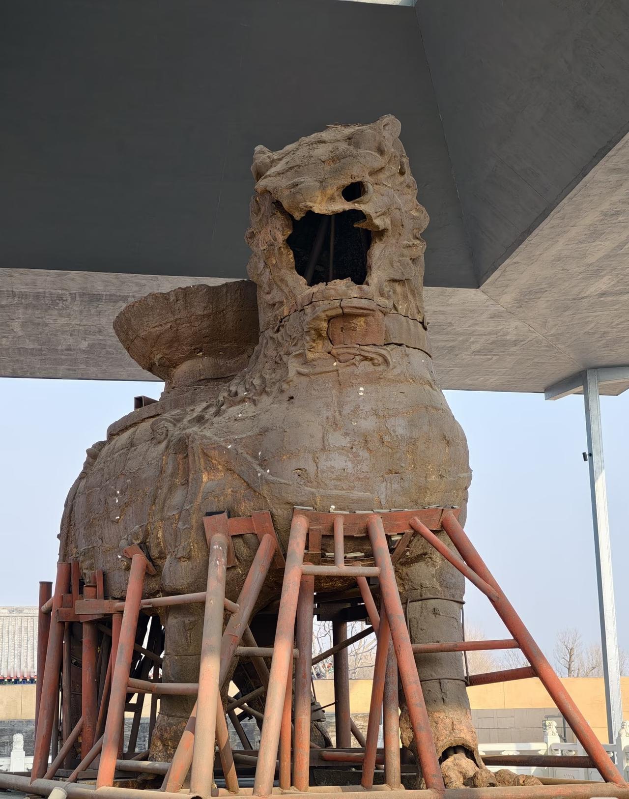 沧州铁狮子几十年前还有嘴巴,加上亭子,困住四肢后,已经面目全非。 还记得黄河大铁牛现在在山西运城一直是在露天广场,当地人啊,小孩子啊,都可以去摸去看,锃亮[捂脸][捂脸]