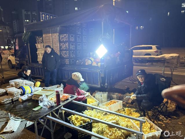市场门前的紫薇中路上,同样十分热闹。有卖水果蔬菜的、捏馄饨饺子的、烤羊肉串的、包饭团的、煎煎饼的……各式各样的小摊绵延近3公里,“跨”过好几个红绿灯路口。这部分摊贩都是拉着车来的,生意体量有大小,因此三轮车、小轿车、厢式货车等都有。