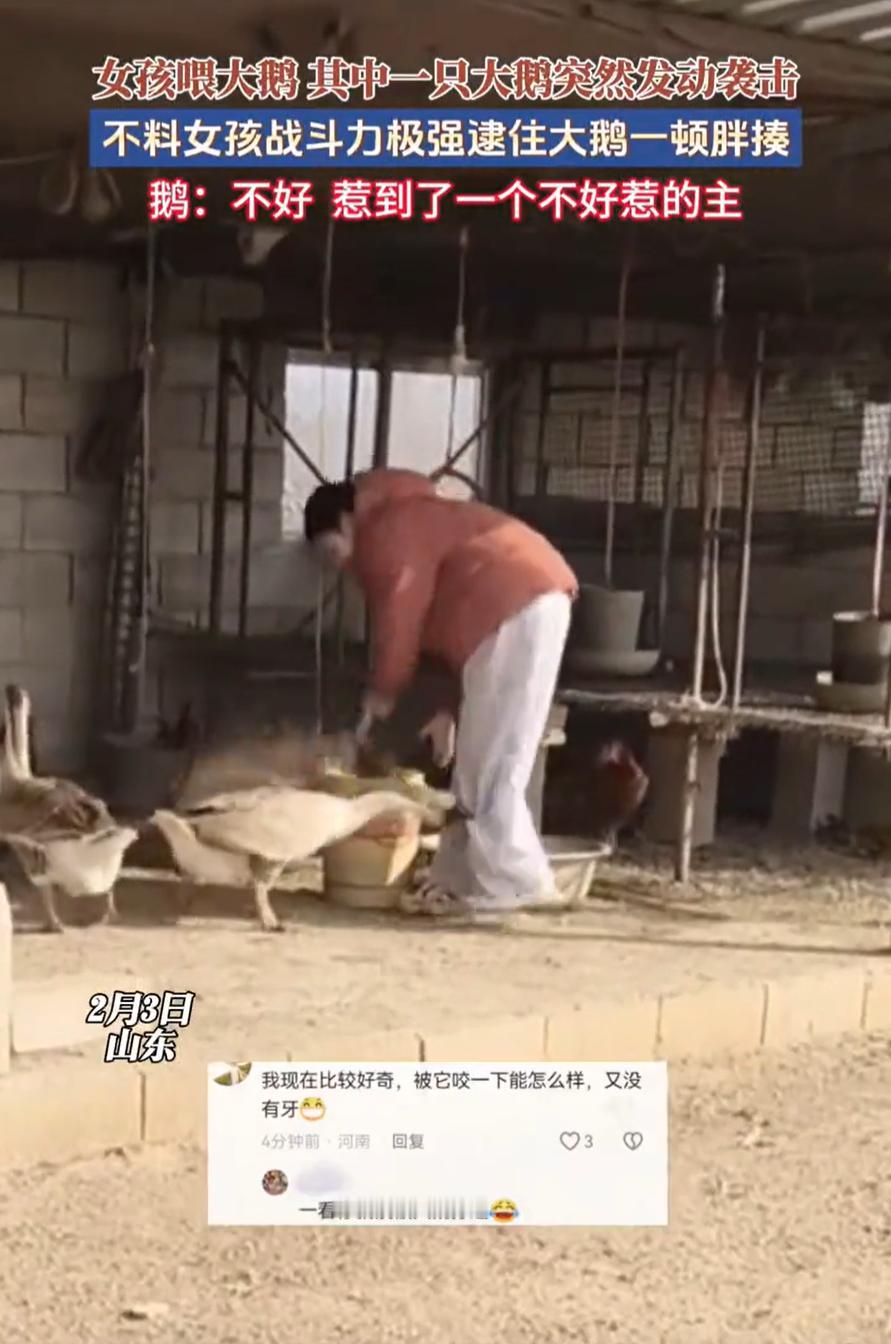 村霸这次也栽了!山东,一大学生放假回家,帮家里喂大鹅时,一只大鹅突然对女生发动袭击,没成想,女生不但没害怕,反而战斗力极强,直接把大鹅给打老实了,妈妈询问要不要把大鹅做掉,女生表示等把它打服再说 从家里的监控能看到,当时女生提着喂食的桶走到院子里,刚把桶放在地上,一只大鹅就凑了过来。谁也没料到,它没有急着吃食,反而突然一口就咬在女生的腿上。这一下要是换个人,可能早就吓得跑开了。但这位女生反应很快,抬腿就给了大鹅几脚。哪怕大鹅已经松了口,她也没打算就此罢休 大鹅似乎觉得不服气,扭过头来又想咬第二口。这下女生更不客气了,巴掌和脚一起上,最后干脆抓着大鹅的脖子,一把给它摔了出去。这一摔,大鹅算是彻底老实了,再没敢上来挑衅 事后妈妈问女儿,要不要把这只惹事的大鹅给处理了,女孩似乎还有气,表示还要再揍它,等它老实了再处理 有网友说:这还是头一次看到村霸被打服了 确实如此,“村霸”这外号安在大鹅身上,还真不是冤枉它,农村长大的孩子,尤其是八零后、九零后那一代,谁童年里没被大鹅追过几回?那家伙,昂着脖子,扑棱着翅膀,嘎嘎叫着冲过来,气势比狗都凶 小时候个子矮,看它那架势,真跟面对什么庞然大物似的,心里发怵,边哭边跑是常事。它这一追,能撵你半条巷子,不啄你裤腿一下决不罢休。所以啊,在很多人心里,大鹅“村霸”的形象,那是从小用“心理阴影”给夯实的 为啥大鹅这么横?你看它那配置就明白了。脖子长,视野宽,有点风吹草动它最先察觉。嘴扁,边上还带锯齿,拧起人来那是真疼,比被掐一下厉害多了。而且它不怕人,领地意识特别强,院子里它觉得都是它的地盘,你进来那就是“入侵”,它得履行职责。狗看家靠叫,大鹅看家,那是真敢上嘴 所以这回看到一位姑娘,不但没跑,反而三下五除二把它给制服了,大家才觉得这么新鲜,这么解气。这颠覆了好多人的童年记忆,原来那不可一世的“村霸”,也是可以被打服的