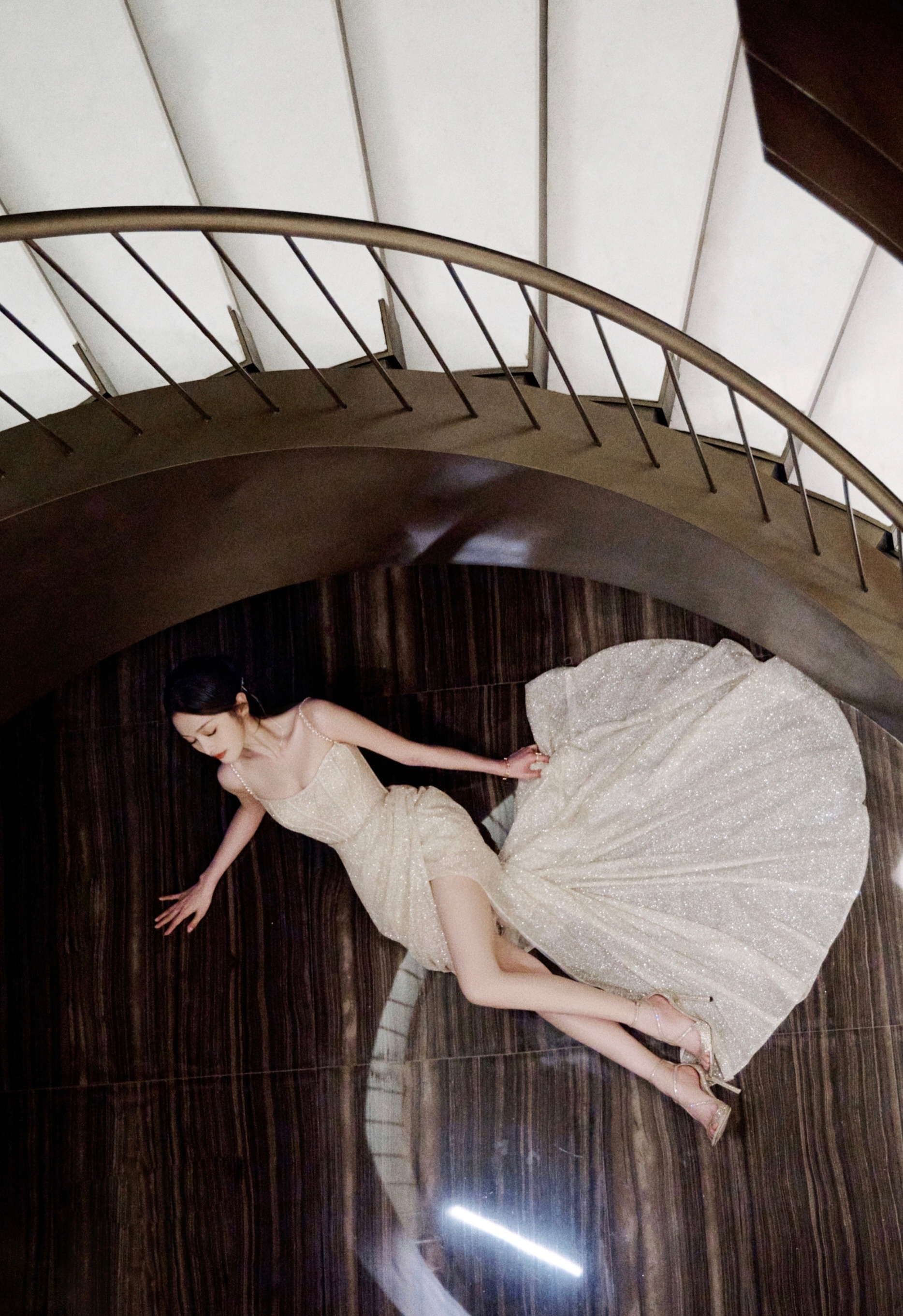 吴宣仪 渐变闪钻吊带长裙,紧致的米白色闪片抹胸搭配细吊带凸显肩颈线条;白桃粉渐