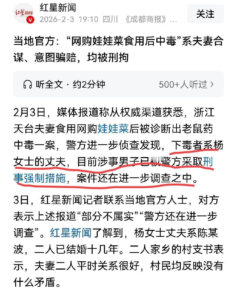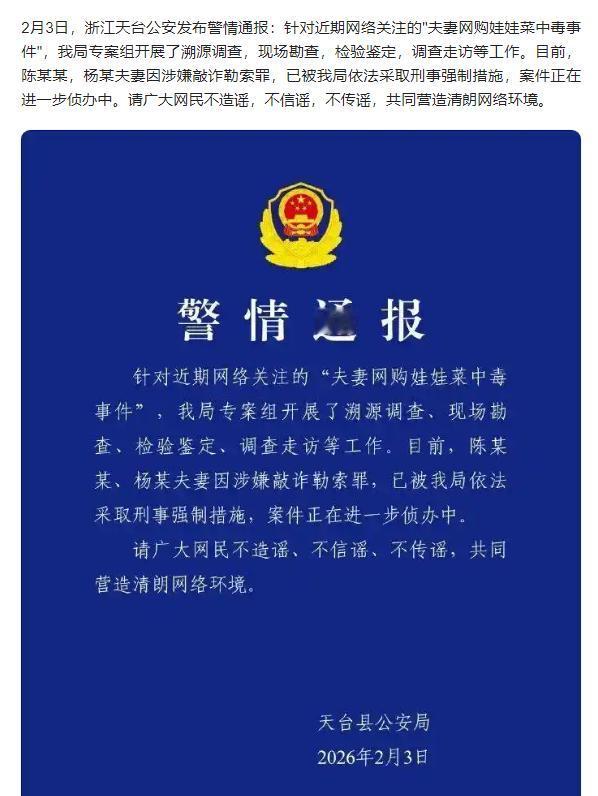 浙江娃娃菜老鼠药中毒事件又反转了,夫妻俩被刑拘,山东菜商被白网暴了。 前段时间浙江台州出现了一起夫妇俩食用含有毒鼠强的娃娃菜中毒进医院的事情。 据了解,娃娃菜是山东发货的,菜商也是山东的。一时间网友纷纷指责山东,山东菜农、平台都开展自查,菜商更是吓得把店注销了。 一开始是怀疑菜农用了毒鼠强,但这不太可能,真要这样的话那么中毒的肯定不止这对夫妻。而菜商也不太可能,一来菜商和这对夫妻无冤无仇,二来菜商真要下毒中毒的也不可能就这对夫妻。 于是警方怀疑是包装菜的旧报纸沾染了毒鼠强。 反转来了,警方查到了,丈夫曾经网购毒鼠强,于是丈夫被抓了。 就在人们认为又是一起杀妻案的时候,警方宣布两口子以敲诈勒索罪刑拘。 看样子这两口子是狠人啊,为了敲诈,居然吃了毒鼠强。有这种毅力,还怕挣不到钱吗?就算敲诈到了钱,健康没了,再有钱又能怎么样?何苦如此啊!