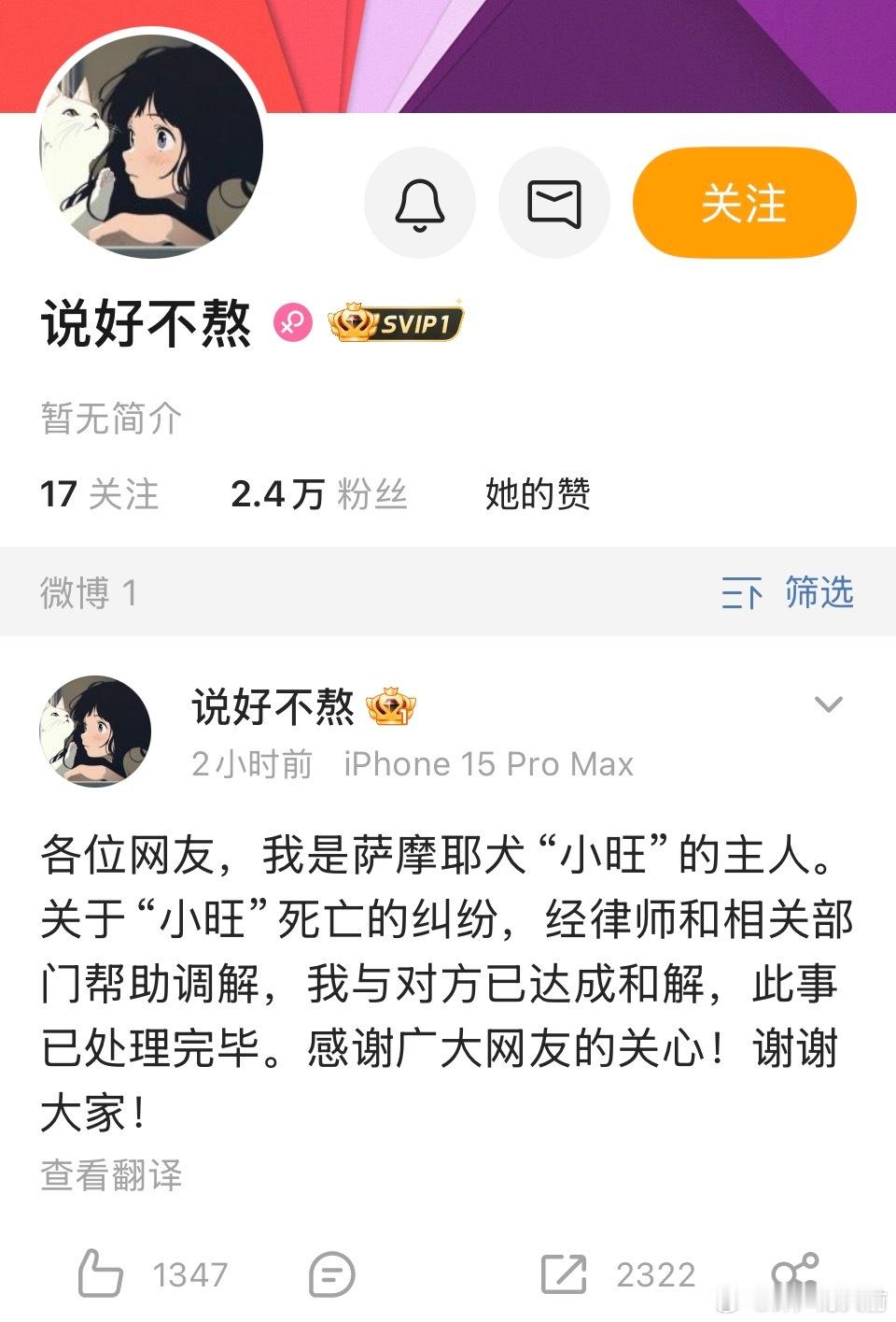 萨摩耶狗主人说好不熬,跟烧死狗的俩男孩家和解了,其他维权wb也都删除了,唉,也能理解,希望她早日走出伤痛狗狗早日安息吧