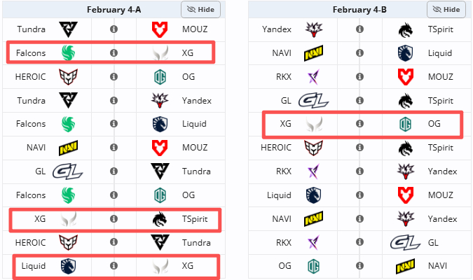 18:00 XG vs FLCN21:00 XG vs OG01:00 XG vs Spirit03:00 XG vs Liquid