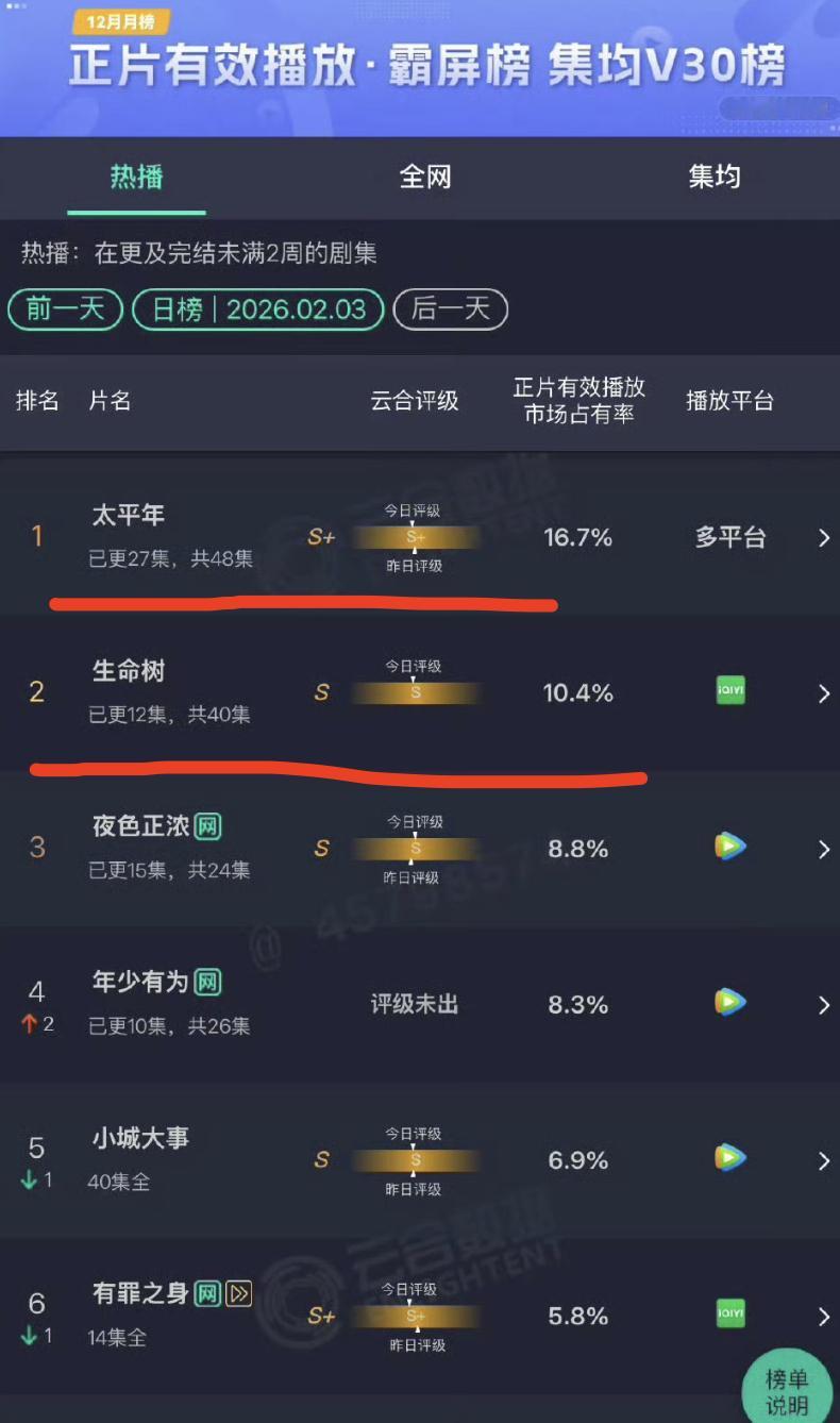 0203云合 太平年下沉市场发酵,继续稳做第一位;生命树预期不足,下调降级到s;年少有为和夜色正浓正向反馈,走势不错,继续爬升;新剧风过留痕首日不到600万,正常预期水平。