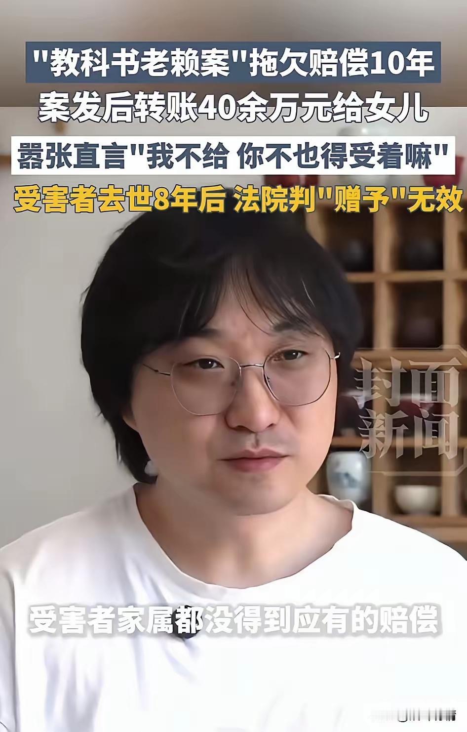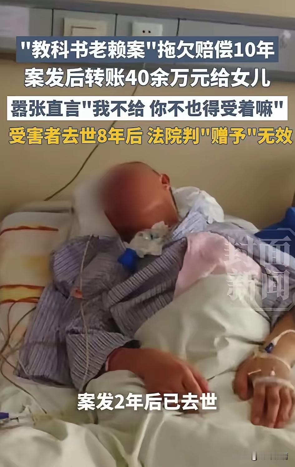 教科书老赖黄淑芬再次翻红, 受害人已经去世多年, 但是他的家人依旧没有拿到赔偿, 如今10年已经过去了, 这个黄淑芬依旧在转移自己的财产, 还将44万赠与给女儿, 法院几十次判决都没有执行, 为什么没有强制执行? 这样的案例简直是个笑话, 如今黄淑芬的赠与直接被法院判处无效,她用来转移自己的财产手段已经无效,如今她居然还能顺利的退休。 几年前看这个案子的新闻记录片,说到出事后黄的女儿立马买了一套房,是否贷款不记得了。就说她女儿吧,那时候二十多岁,掏得出首付?记者问她女儿为什么不卖房子帮妈妈赔偿,答买房是我们全家的梦想。这女儿吧,跟曲婉婷一样一样的,看着母亲在牢里受苦,自己在外面享受着母亲为她挣来的一切,然后把母亲入狱归为他人的错误,她们的逻辑真是杠杠的。 当时看的这个新闻太难受了。因为父亲把房子都卖了,人也没救回来,有一个非常相爱的姑娘为了不耽误人家分手了。 天理昭昭,希望等早日还受害人一个公道。 这种人就得恶人来磨,匿名信,匿名跟踪视频,就让她觉得要对付她家人,她女儿,让她天天疑神疑鬼的,才能够治的了她,让她觉得,总有一天,她女儿,家人会被别人给弄死的那种,当然啦,犯罪的事情咱不敢干,没说不能给予精神上的压力啊,让她觉得,把受害人逼疯了,拉她全家一起死的那种压力才能治得了她。 一个人无耻当老赖是他个人的错,但是如果法律能让一个无耻老赖的人无耻下去,那就不是无耻老赖的错了。 法院还是根本没有认真执行,真要办她,退休金还能让她取走?根本就不可能,账户冻结了,直接划转到被害人账上,还有那个已经赠与的40多万,既然已经判无效,就更可笑了。法院只管判,执行不执行,得看具体法官。 现在就不行了,因为退休了,退休金是国家发放,法院可以强制执行。直接把退休工资扣了直接划给受害人家属。 对于有能力又不还,首先她女儿收到的钱要吐出来 其次她应该坐牢 ,最后她女儿在一定时间内也是不还,那就应该也限高或者坐牢。