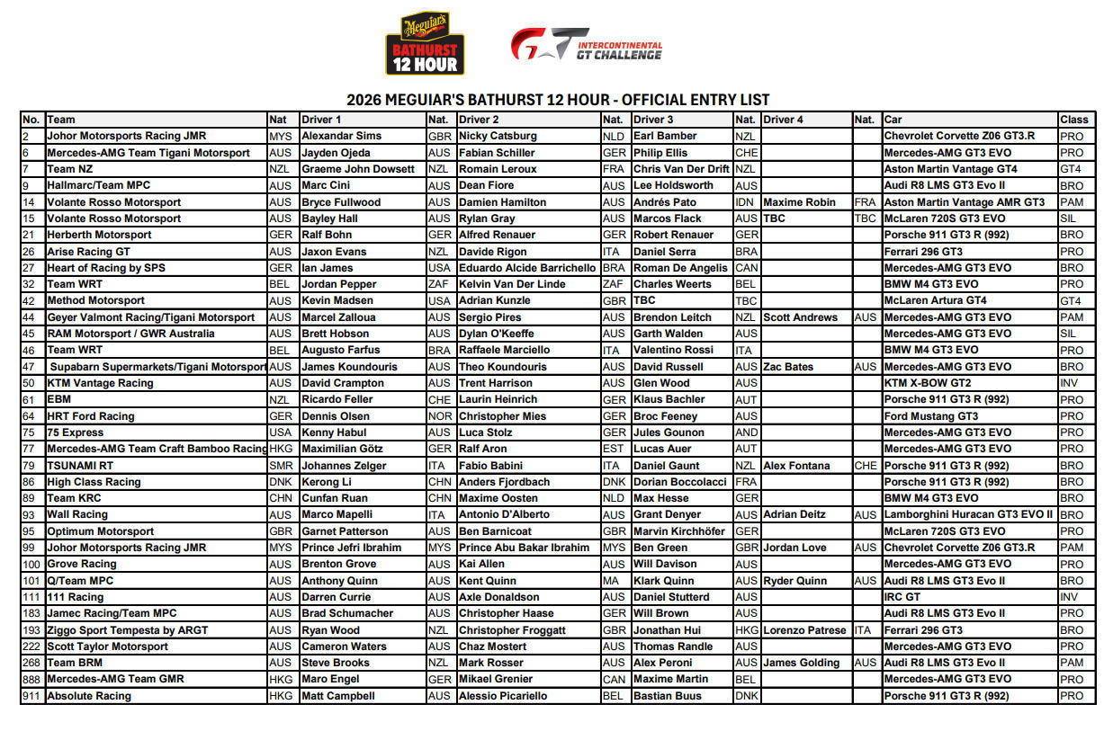 ✅IGTC揭幕战巴瑟斯特名单公布,总共35台赛车,其中有15台Pro GT3,宝马、AMG、保时捷、奥迪、法拉利、迈凯伦、福特、科尔维特都有Pro赛车,是近几年竞争最激烈的一届
