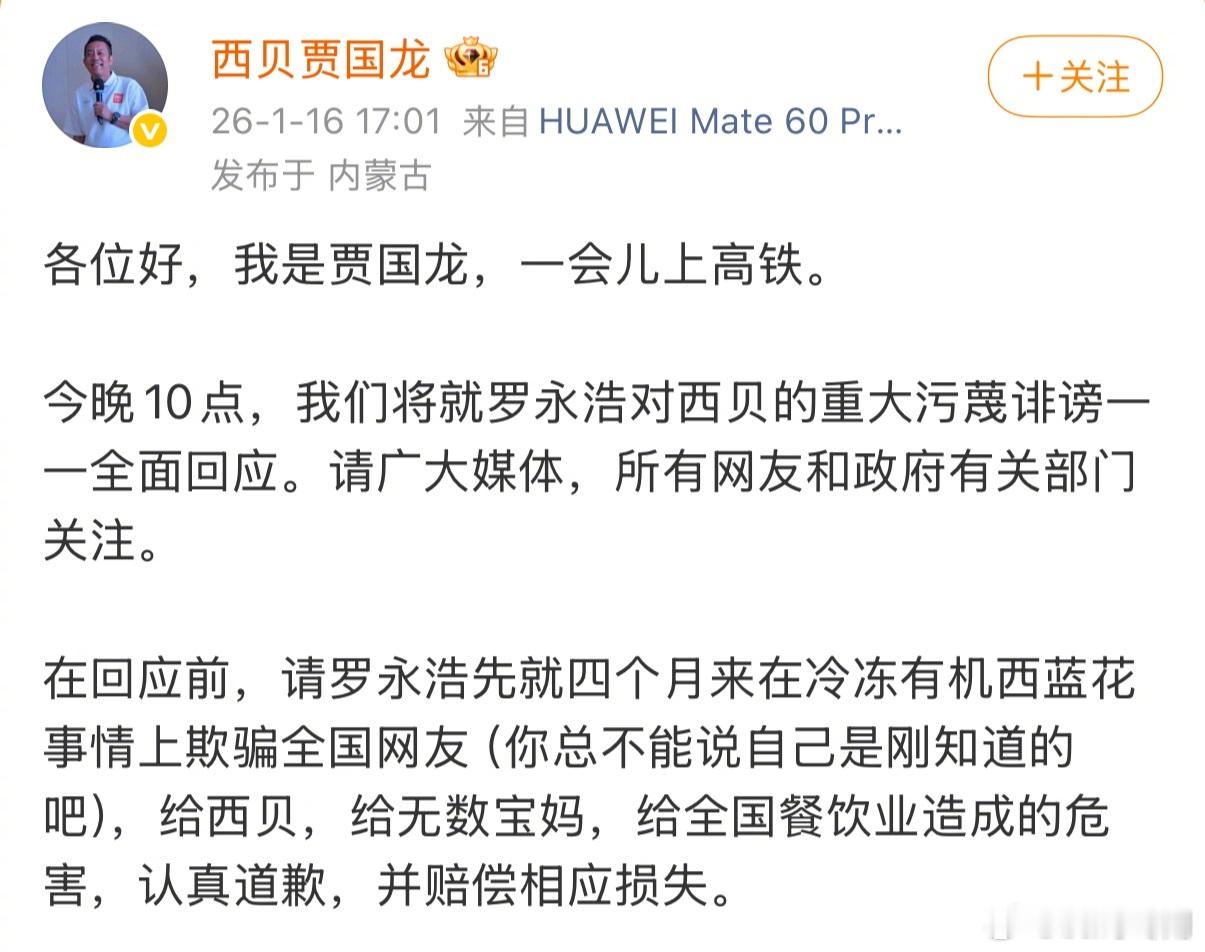 哇!贾国龙说,今晚十点全面回应罗永浩对西贝的重大污蔑
