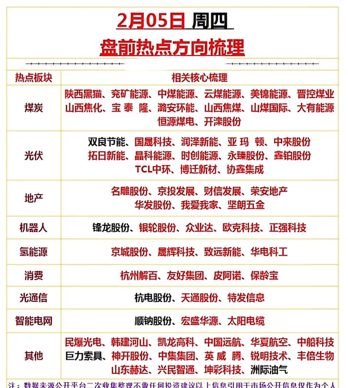 2月5日盘前热点方向梳理,投资必看! 煤炭光伏领涨,氢能机器人活跃,地产消费回
