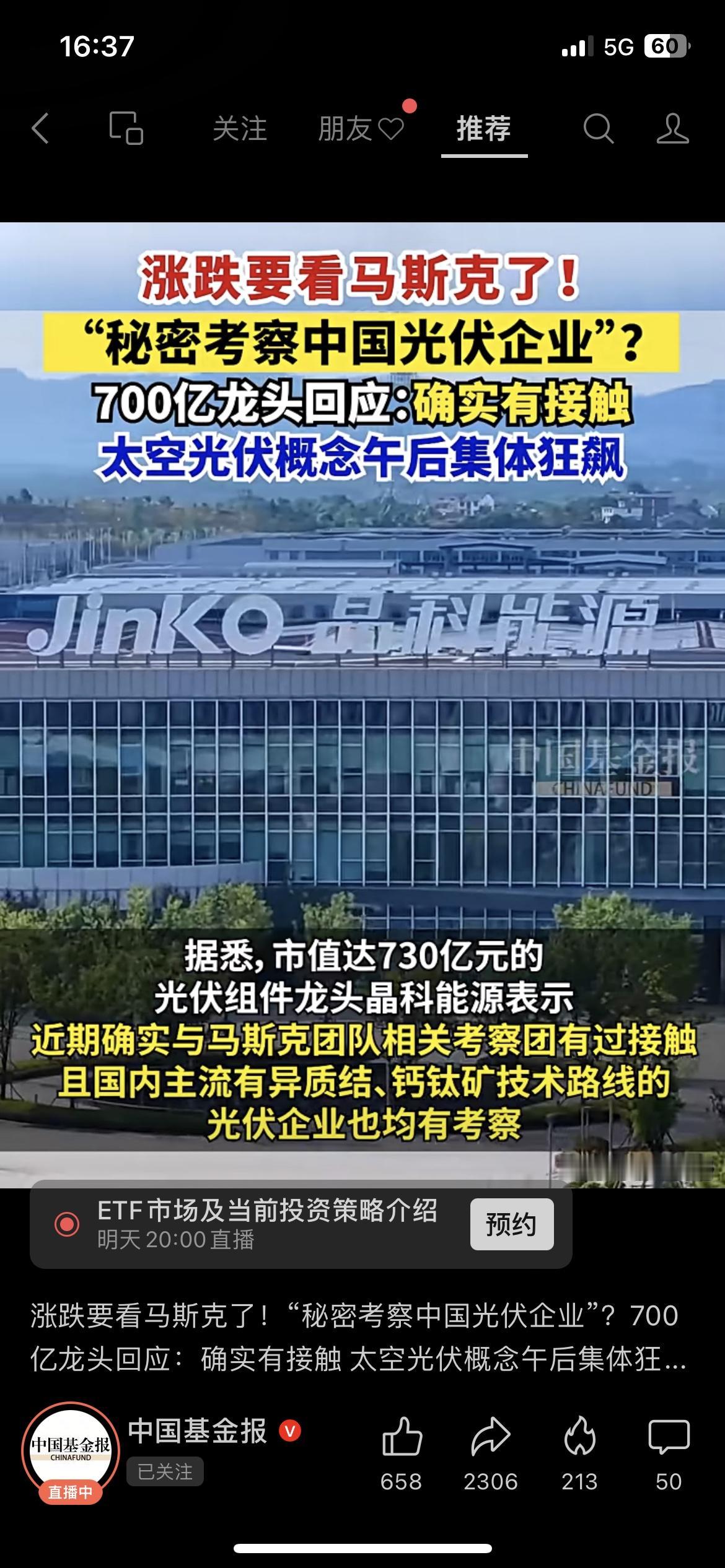 马斯克密访中国光伏!太空光伏疯涨 晶科能源确认马斯克团队考察中国光伏企业,太空光伏板块午后暴涨,多股20CM涨停。 马斯克的一句感兴趣,就能带飞一个赛道。 市场有风险,投资需谨慎。 你觉得太空光伏是短期炒作,还是真有长期逻辑? 马斯克 太空光伏 光伏ETF