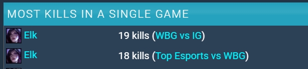 直播吧2月4日讯今日LPL第一赛段组内赛WBG首局不敌AL,而本场比赛中Elk操刀卡莎狂砍17杀。这也是LPL目前单场比赛第三高的击杀记录,值得一提的,目前LPL本赛季前三的击杀记录均由Elk操刀卡莎所创造。