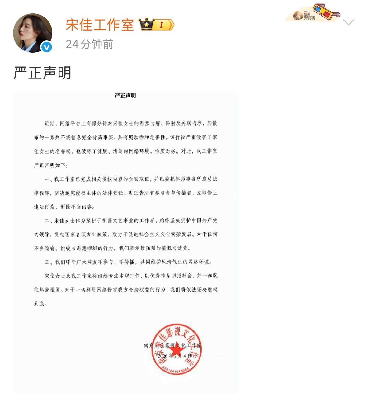 宋佳工作室严正声明宋佳方严正声明 2月4日,发布严正声明。