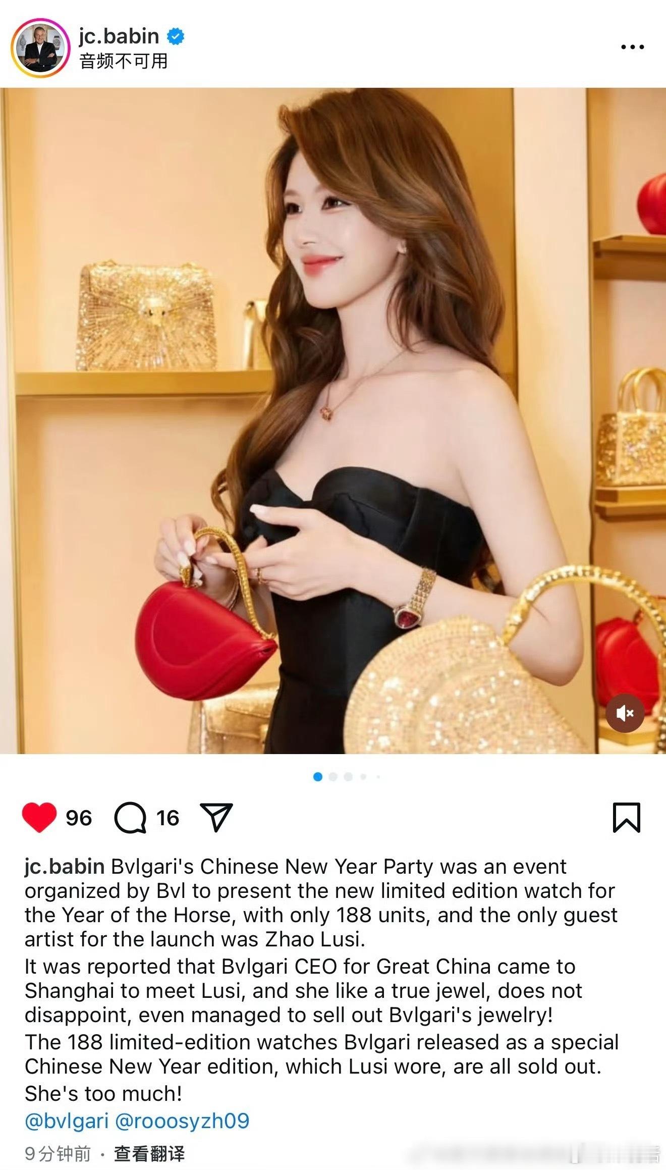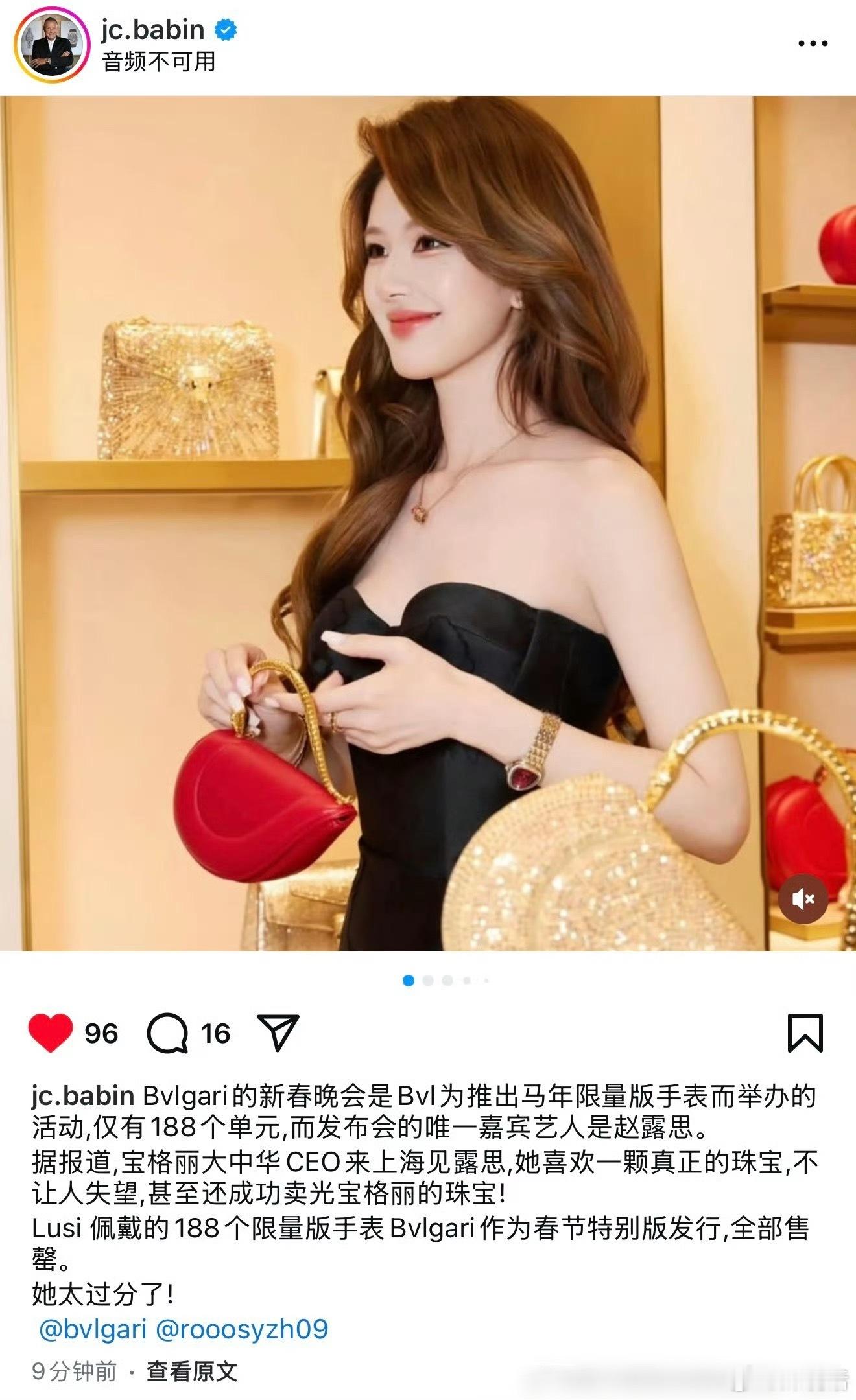 宝格丽今天发了赵露思带了title,然后ceo又在ins上发了说她是唯一邀请的艺