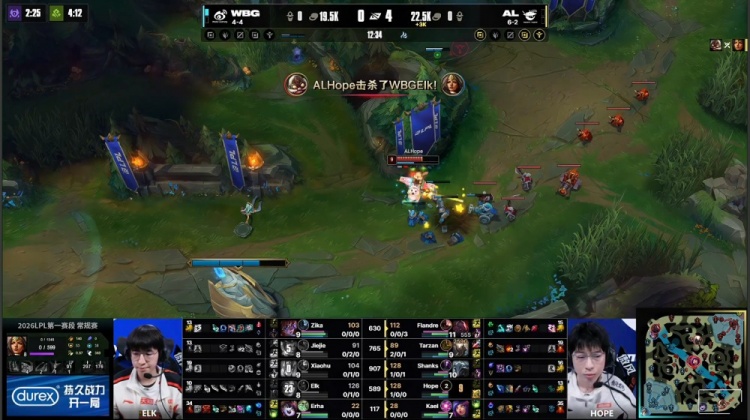 [12:08]上河道团战WBG吃河蟹出事,Tarzan潘森先杀xiaohu加里奥,Flandre奥恩砍掉Jiejie,AL打出0换2,同时下路王杰飞机飞脸单杀Elk希维尔,AL经济领先2.8k。