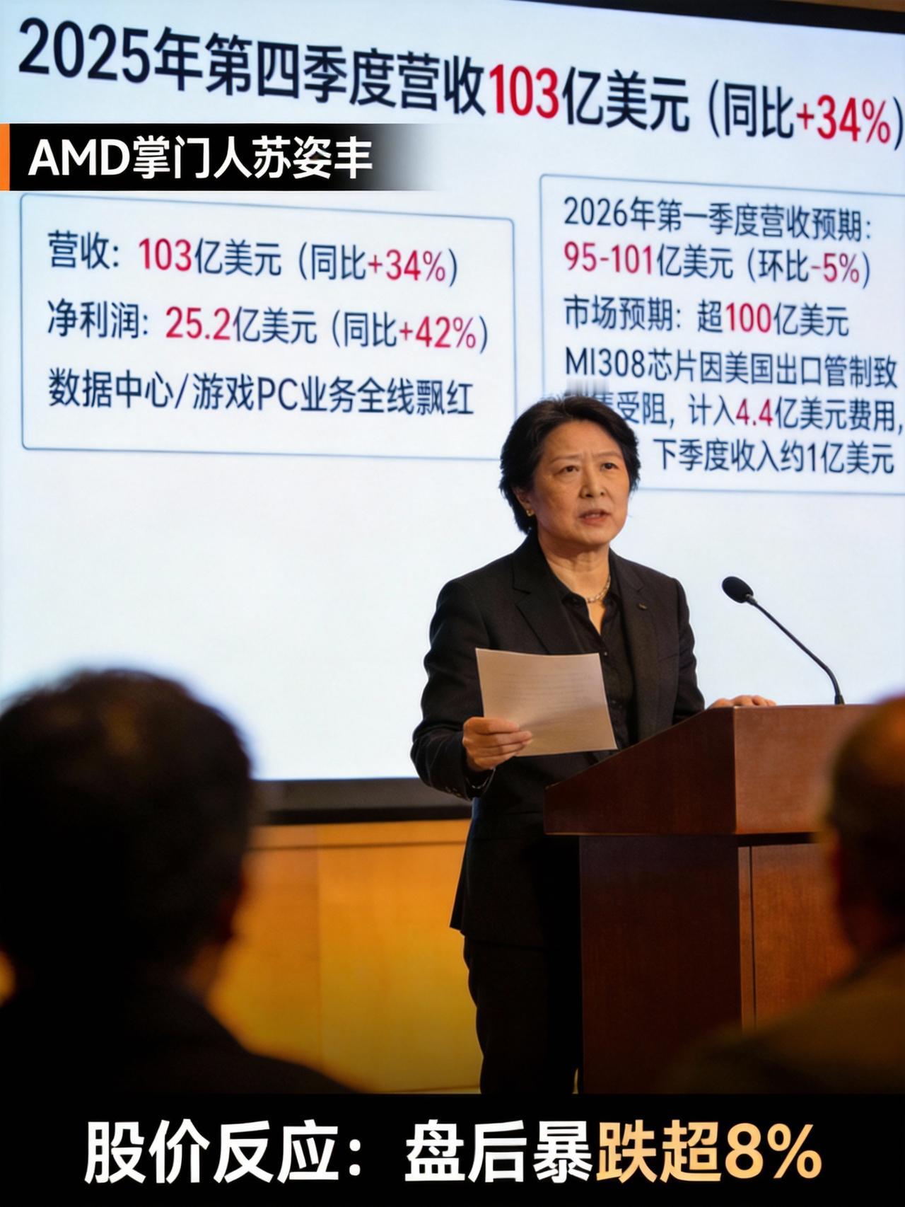 一个人,交了一份破纪录的成绩单,却因为对下一场考试的“谦虚”预测,让全班(市场)大失所望,手里的奖状(股价)瞬间就“打折扣”了。 这个人就是AMD的“掌门人”苏姿丰。就在不久前,她刚发布了公司2025年第四季度的“期末成绩”,简直亮眼到不行:季度营收冲上103亿美元,同比猛增34%;净利润也达到25.2亿美元,暴涨42%。这不仅是历史最好成绩,数据中心、游戏PC等几大核心业务也全线飘红。 按常理,这该放鞭炮庆祝了。但资本市场这个“老师”看的是下一场考试。当苏姿丰给出下一季度(2026年第一季度)的“学习目标”时——预计营收95到101亿美元,气氛就变了。 虽然这个目标依然很高(同比增长32%),但比起刚破纪录的第四季度,预计会环比下滑约5%。更关键的是,市场上最乐观的“学霸”们此前预测能超过100亿美元,甚至期待能看到更猛的势头。这个“略微保守”的指引,让一些投资者觉得,AMD在火爆的人工智能(AI)芯片赛道上追赶英伟达的速度,可能没想象中那么“飙车”。 另一个隐忧是“中国市场”这门选修课遇到了政策变化。 由于美国的出口管制,AMD专门为中国市场设计的MI308芯片销售严重受阻,为此公司还计入了高达4.4亿美元的相关费用。苏姿丰预计,下一季度来自这部分芯片的收入仅约1亿美元。这扇重要的大门不能完全打开,无疑也给未来的增长蒙上了一层不确定的阴影。 所以,尽管过去考了满分,但市场这位“老师”还是因为对未来的“担忧”,给了个“差评”:财报发布后,AMD股价盘后一度暴跌超过8%。 大家聊聊看,这种“考了第一却说下次可能退步一点”,结果被市场狠狠“惩罚”的现象,是市场太苛刻、太短视,还是上市公司管理层必须学会的一堂“预期管理”课? 人活一辈子,金钱健康哪个重要 新一线城市合肥真的有发展前景吗 安徽未来发展的潜力大吗 你最喜欢深圳的哪个自然景点 如何用一句话形容合肥近十年的发展 安徽合肥怎么样 人与人之间最珍贵的东西是什么? 说到合肥,你会想到合肥哪里