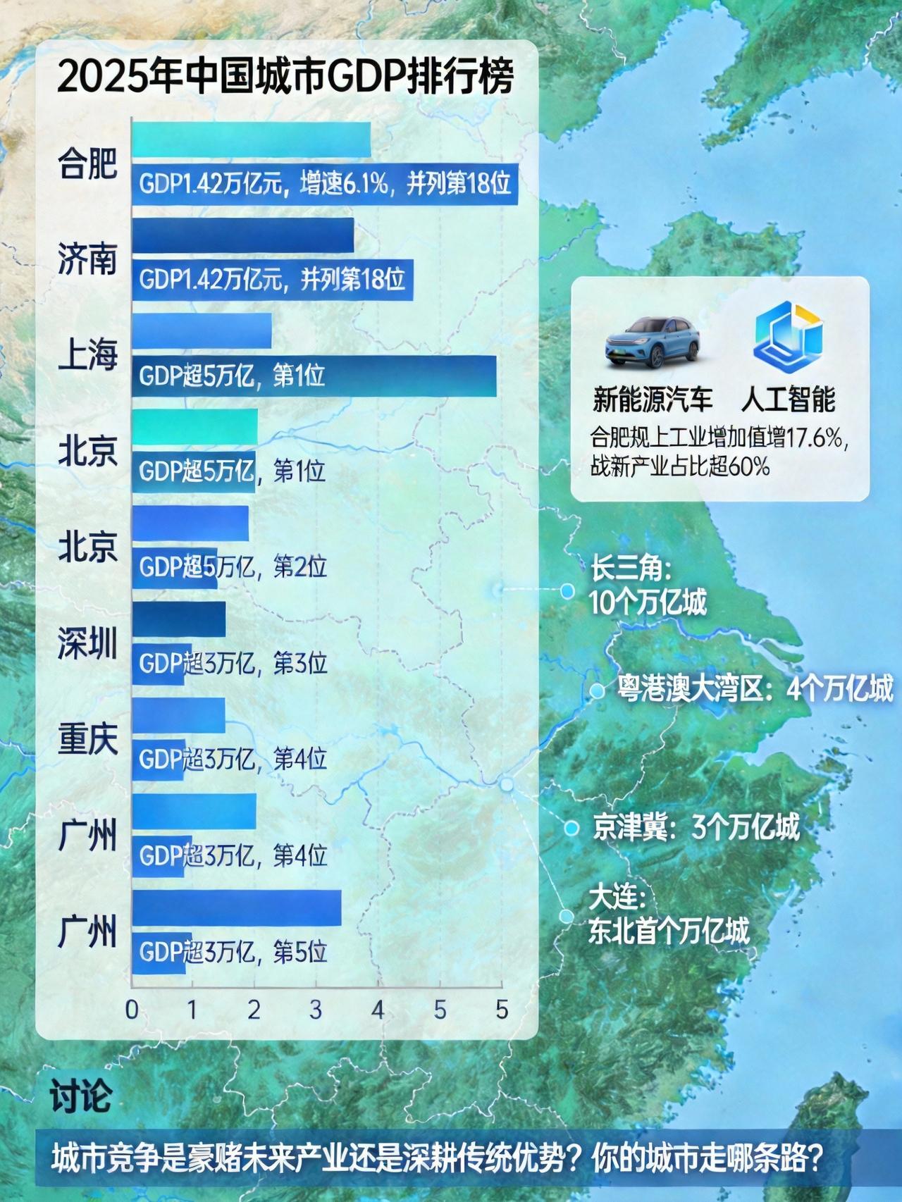 曾经被调侃为“最大县城”的合肥,在2025年干了一件大事:它用一份增速高达6.1%的成绩单,把经济总量做到了1.42万亿元,一口气追平了济南,并列全国城市GDP排行榜第18位,创下了自己的历史最佳排名。 更厉害的是,在这顶尖的20个城市“赛场”上,合肥的增速是跑得最快的那个。这可不仅仅是数字游戏,它背后是实打实的“硬核”产业在发力。2025年,合肥的规模以上工业增加值增长了17.6%,战略性新兴产业产值占了规上工业的六成以上,像新能源汽车、人工智能这些新赛道,合肥可是卯足了劲在冲。 除了合肥这匹“黑马”,这场城市排位赛的头部依然稳固。上海和北京毫无悬念地稳坐前两名,而且双双迈入了“5万亿”俱乐部,这个经济体量,已经堪比一些欧洲国家了。深圳、重庆、广州也都超过了3万亿元。 从地图上看,财富和活力正在更广的区域蔓延。长三角不愧是中国经济的“压舱石”,足足有10个城市GDP超过万亿。粤港澳大湾区和京津冀地区也分别有4个和3个“万亿之城”。就连东北地区,也迎来了首位“万亿城”成员——大连。 结尾讨论点: 看来,城市竞争就像一场没有终点的长跑,有人一路领跑,有人中途加速。合肥的逆袭,靠的是押注前沿科技和新兴产业。大家觉得,一个城市要实现“弯道超车”,是应该像合肥这样豪赌“未来产业”,还是更应该深耕自身的传统优势呢?你的城市走的是哪条路?来评论区聊聊吧!合肥GDP增速 合肥GDP 合肥城市竞争力 合肥经济增长 合肥实力 合肥现状 合肥gdp 合肥规划 合肥现状 合肥发展规划 合肥千亿县 合肥地图 合肥各区gdp 合肥宜居城市 合肥都市圈扩容 合肥发展新蓝图 合肥城市新蓝图 未来的合肥 合肥超越