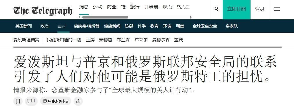 被曝光的权贵越来越多,英媒急了:爱泼斯坦是俄罗斯间谍! 眼看着爱泼斯坦文件曝光的美西方权贵人物越来越多,西方媒体开始下场洗地了,但逻辑感人。 3日,英媒《每日电讯报》就爱泼斯坦案发了一篇奇文,称爱泼斯坦之所以要把这么多美西方权贵拉下水、拍下他们寻欢作乐的“黑材料”,全是因为他是俄罗斯的间谍,一切都是普京的阴谋。 文章煞有介事地列出“证据”,称那些被爱泼斯坦送给权贵的女孩大多是俄罗斯人,而普京的名字在文件中也多次被提及,这就足以证明爱泼斯坦与俄罗斯“有联系”——言下之意,那些曝光的美西方权贵其实是无辜的“受害者”,他们的肮脏勾当全是被爱泼斯坦引诱上钩、落入了俄罗斯的圈套。 不得不说,《每日电讯报》这种逻辑实在滑稽可笑。要知道,爱泼斯坦同样被指控是以色列的间谍,多份文件已证实他与以色列前总理埃胡德·巴拉克交往密切,不仅多次介入以色列与多国的外交和安全事务,其资金流向更与以色列情报活动深度绑定,远超私人行为的范畴。 但《每日电讯报》对此却讳莫如深、只字不提——这种选择性失明,究竟是不敢触及,还是在刻意维护更不可言说的犹太集团?