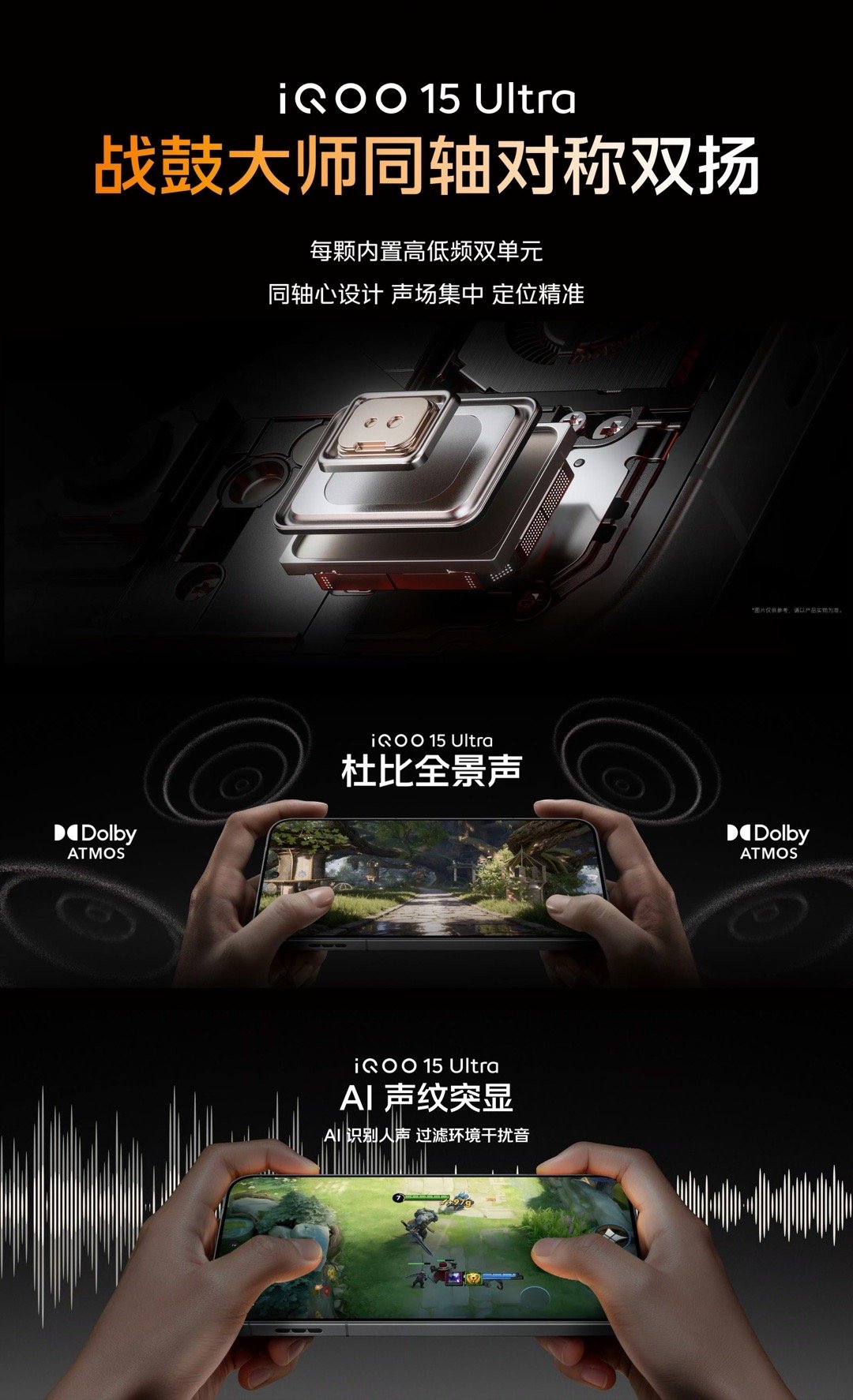 iQOO15 Ultra全新战鼓大师同轴对称双扬声器:一颗扬声器同时内置高低频双单元,并将独立高音单元直接嵌入低音单元的中心;首次搭载杜比全景声,打造三维环绕声场;通过AI识别你的人声特征,精准屏蔽环境杂音;②战锤MAX双轴振感马达:576mm³的091640马达,强劲、有力、干脆③能量光刃:支持八大类通知,12种色彩调节iQOO15 Ultra新品发布