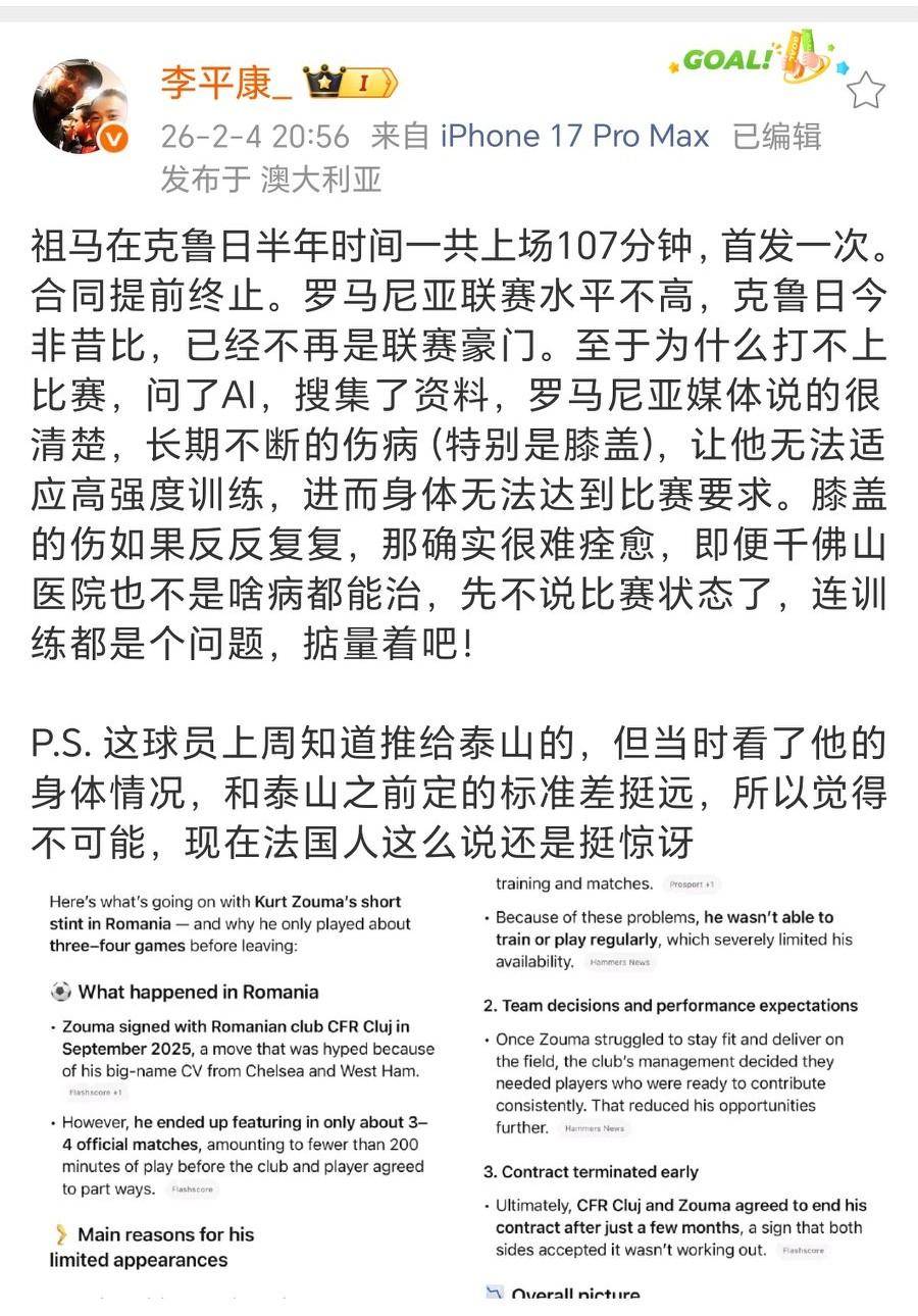 关于网传山东泰山队引进前切尔西球星祖马,各方的不同观点,什么人着急了,什么人说谨