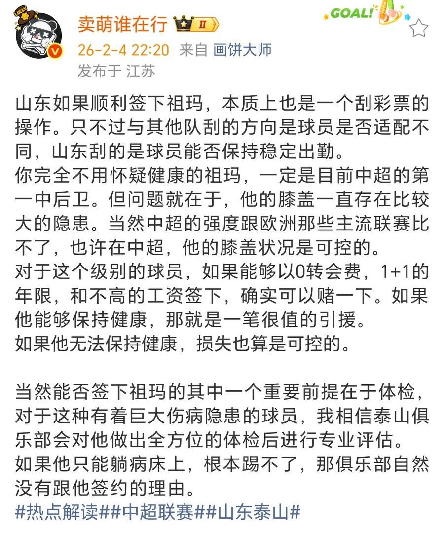 关于网传山东泰山队引进前切尔西球星祖马,各方的不同观点,什么人着急了,什么人说谨慎,这里边利益关系一目了然! 第一个说祖马踢不上球了的,是李平康 第二个说祖马训练都无法保证了的,是经纪人金畅。 第三个说祖马的,是徐江,不过他是建议金畅给找一个,但是溢价太高就算了,好像话里有话。 不过,知名博主“卖萌谁在行”说的比较客观,祖马的能力毋容置疑,关键是伤病,有的隐患,但是这次泰山队是0转会费,合同是1+1,薪水也不会太高,就赌他的膝盖伤病,也不会损失太大。最重要的就是体检,相信泰山团队对体检的把握。 个人认为,只要体检能过关,祖马踢中超问题不大,他的薪水比洛佩斯高不哪里去,要是1+1的合同,完全可以。山东泰山队