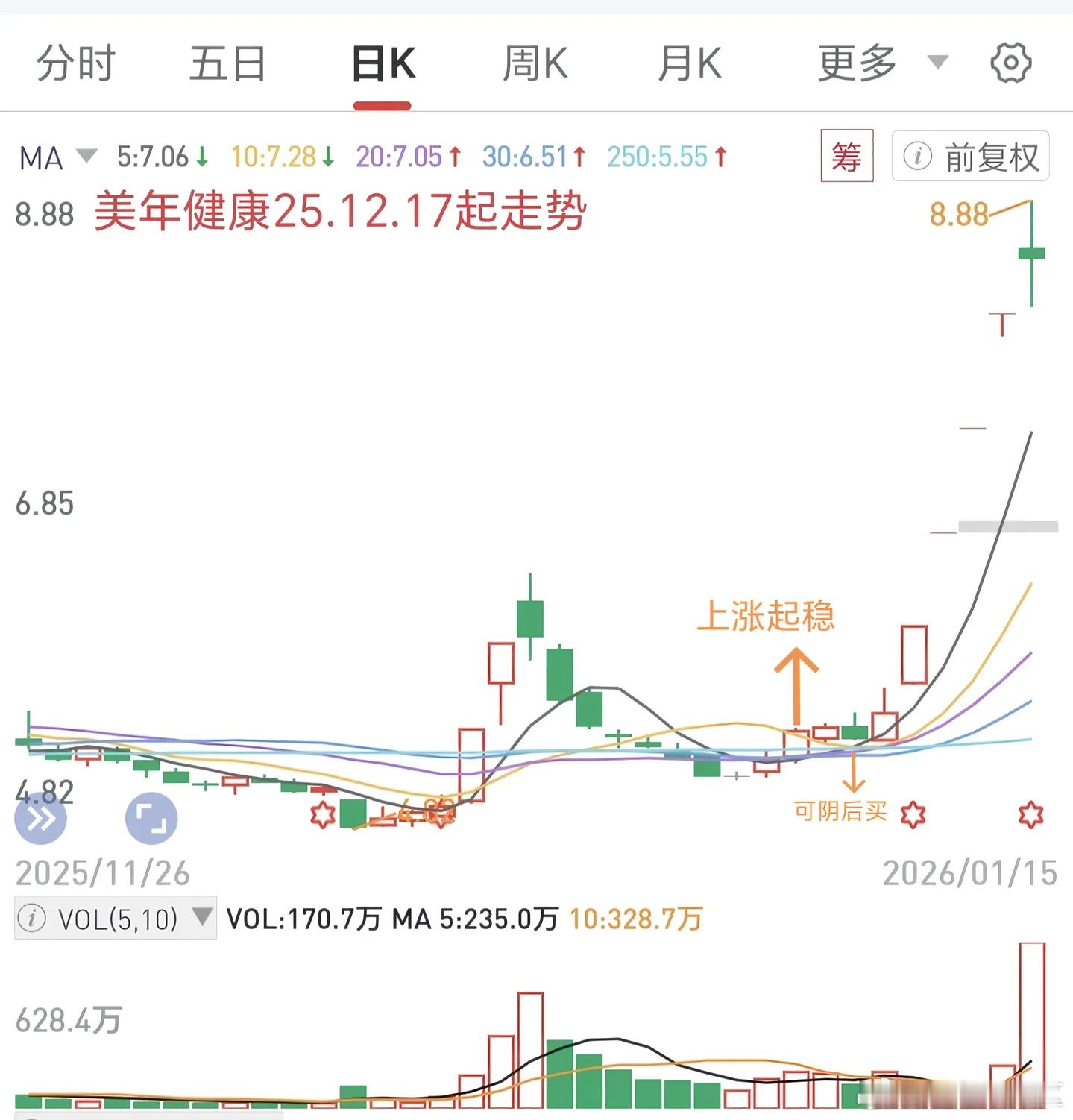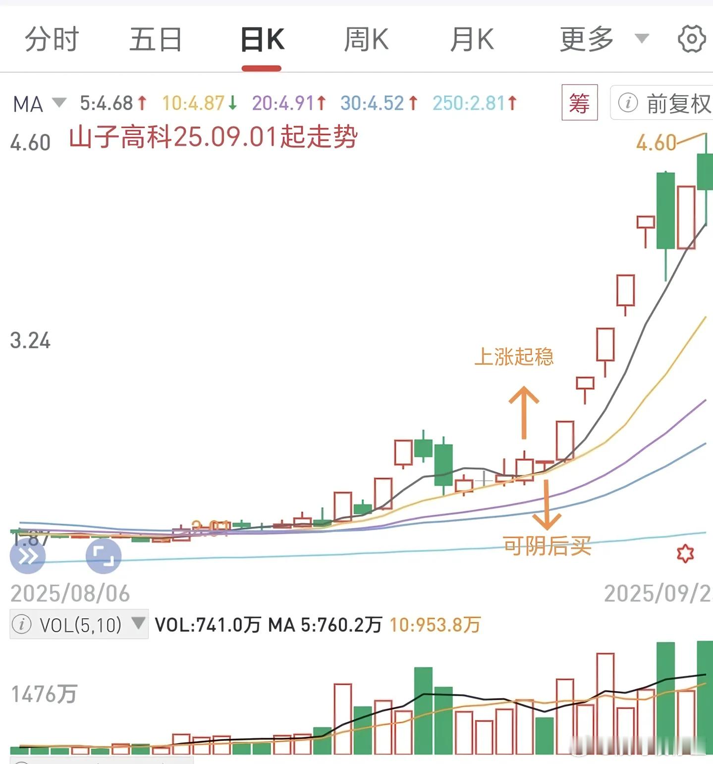 3.均线支撑:5日均线向上拐头,重新上穿10日均线,形成金叉,且股价站稳在均线上方。第三.介入时机 1.稳健型:回调企稳后,出现第一根放量阳线时介入,对应图中的“可阴后买”。2.激进型:股价突破前期高点时,若伴随成交量放大,可在突破瞬间跟进。3.止损原则:若股价有效跌破20日均线,或回调幅度超过第一波涨幅的50%,需及时止损离场。