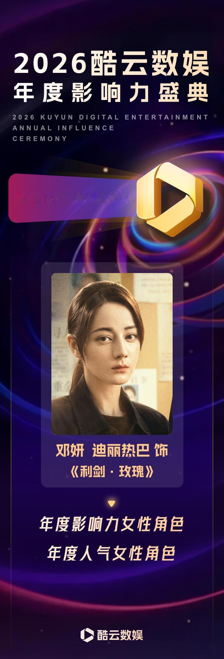 恭喜迪丽热巴《利剑·玫瑰》邓妍斩获酷云数据年度影响力女性角色年度人气女性角色双项