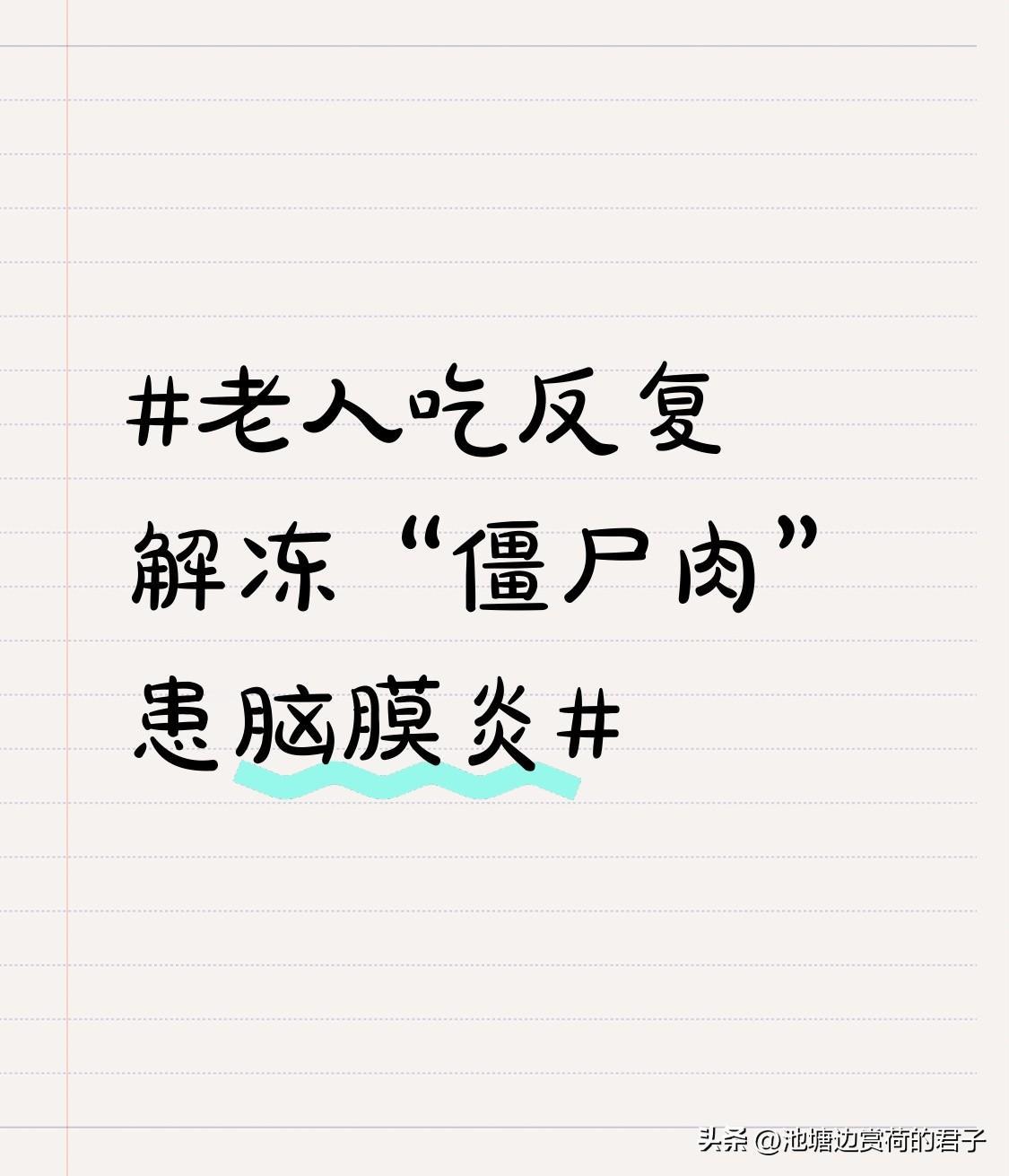 老人吃反复解冻“僵尸肉”患脑膜炎 最近“老人吃反复解冻‘僵尸肉’患脑膜炎”的事儿太吓人了。浙江72岁的王大爷,就因为吃了放冰箱两年、多次解冻重冻的猪肉,感染李斯特菌得了脑膜炎。 李斯特菌耐低温,在-20℃都能存活,0 - 4℃还能繁殖,对老人等免疫力弱的人群致病性强,病死率达20% - 30%。很多老人节俭,把冰箱当“万能保险箱”,觉得肉冻着就没事,反复解冻也不舍得扔。可这反复解冻会让细菌暴增。 这给每个家庭敲响了警钟,冷冻肉有保鲜期,反复解冻是大忌。年轻人得抽空给长辈科普科学存肉知识,别让“节俭”换来病痛和高额医药费。