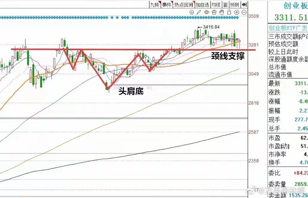 第三,今天创业板指盘中跌幅虽然相对比较大,但是实际上创业板指也有重要的支撑。从创业板指日线图来分析,创业板指日线级别具备一个头肩底的结构,目前正好是回踩到头肩底颈线位置附近。所以从这个角度来分析,创业板指接下来止跌反弹的概率也是相对比较大的。