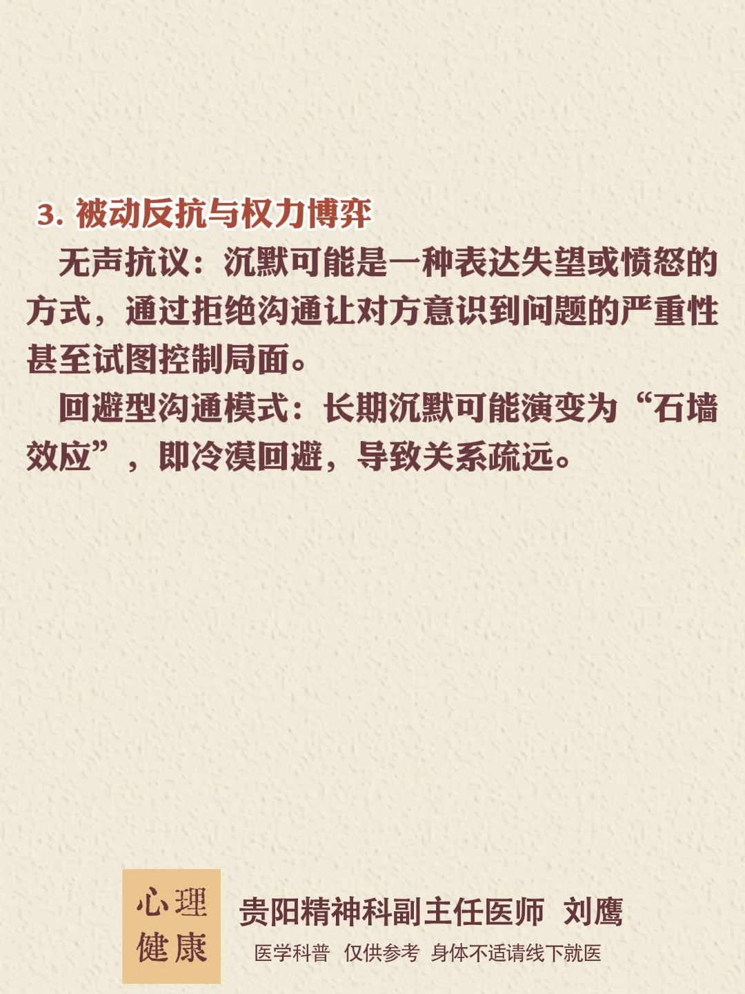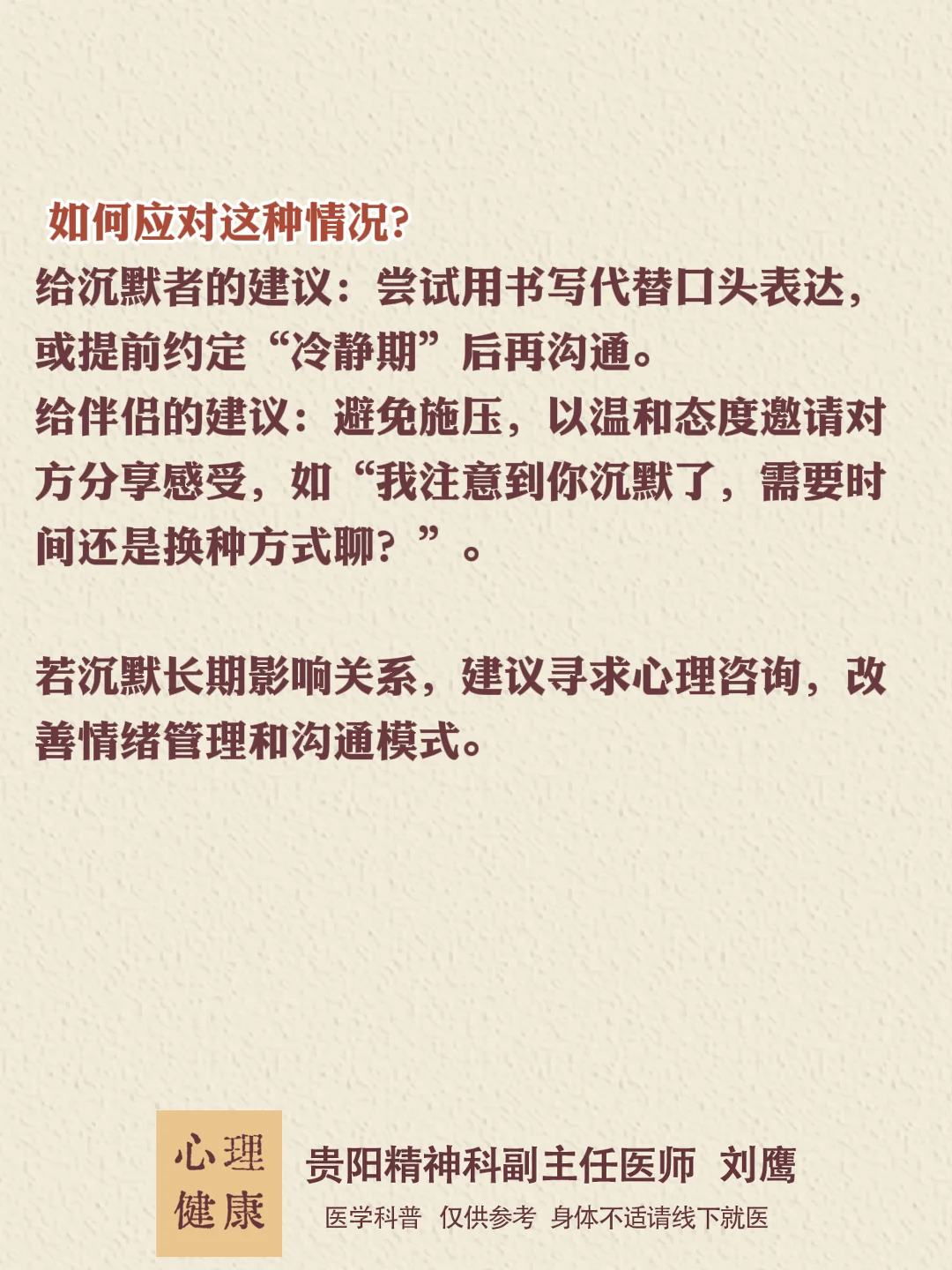 如何应对这种情况? 给沉默者的建议:尝试用书写代替口头表达,或提前约定“冷静期”后再沟通。 给伴侣的建议:避免施压,以温和态度邀请对方分享感受,如“我注意到你沉默了,需要时间还是换种方式聊?”。 若沉默长期影响关系,建议寻求心理咨询,改善情绪管理和沟通模式。
