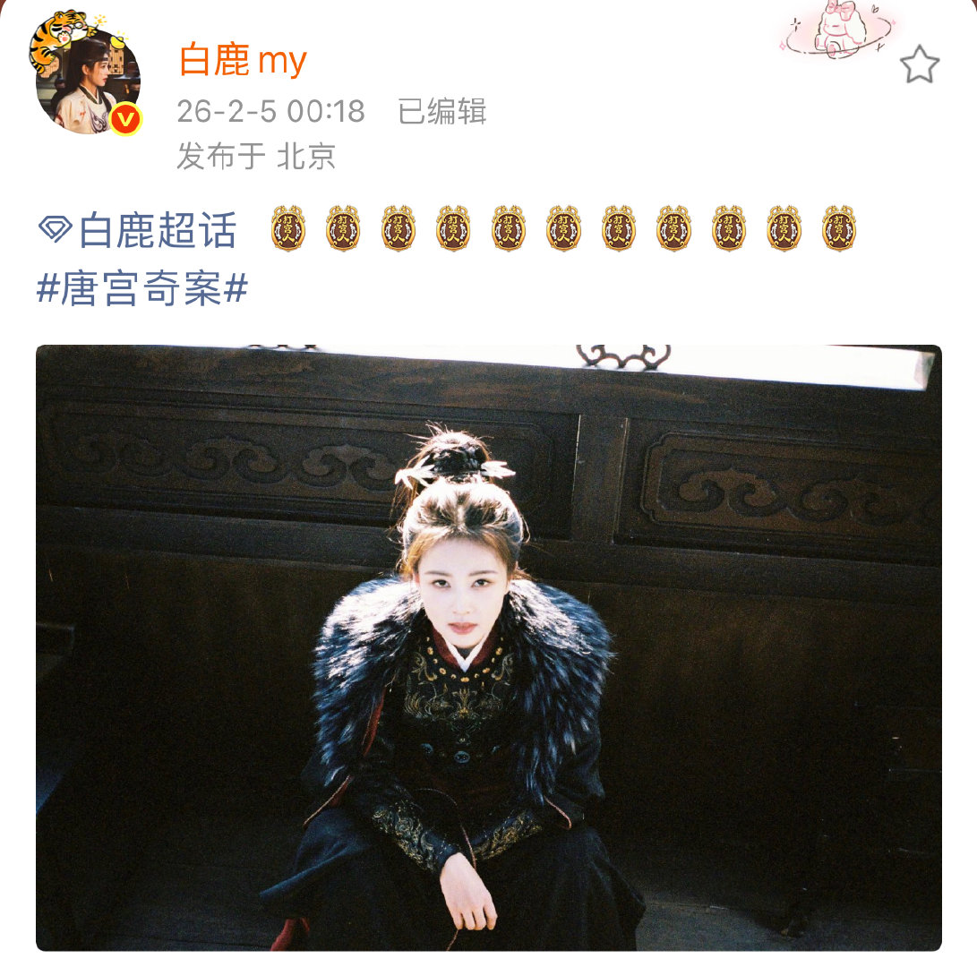 白鹿佩仪来也白鹿唐宫奇案破6000晒照 2月5日,白鹿《唐宫奇案》站内热度破6000晒照,并配文:“ ”。