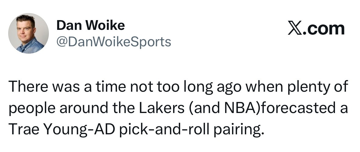 Dan Woike:就在不久前,湖人内部(以及整个NBA圈子)不少人都曾预测,特雷-杨与安东尼--戴维斯会组成挡拆搭档。