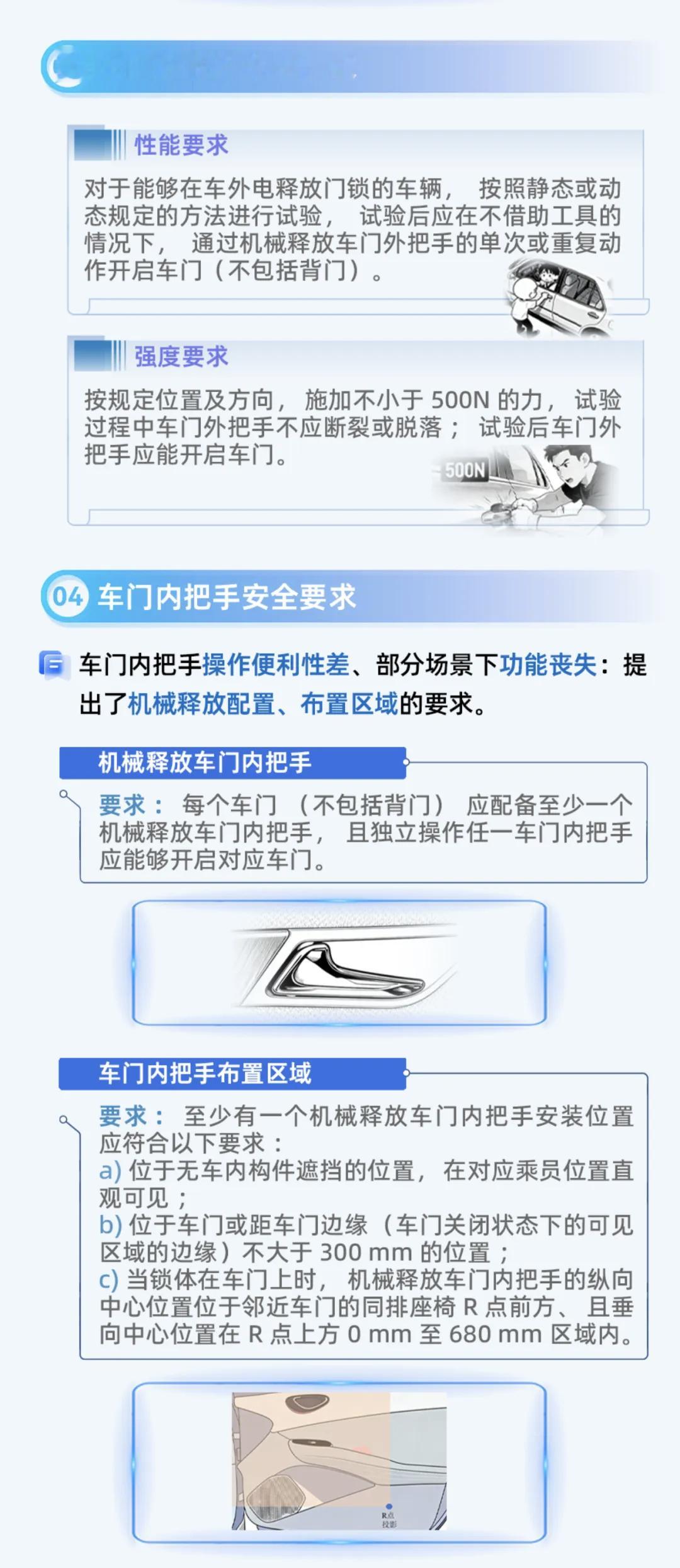 《汽车车门把手安全技术要求》规定,内外把手均需独立机械释放机构,断电(断高压+低压)、碰撞后仍可单次/重复开启,非碰撞侧车门无需工具即可打开,彻底解决“断电打不开”的致命隐患。外把手需位于规定阴影区/邻近区,2028年起手部操作空间强制达标;内把手安装在座椅R点垂向中心0-680mm、距边缘≤300mm区域,无遮挡且直观可见,降低紧急识别与操作时间。