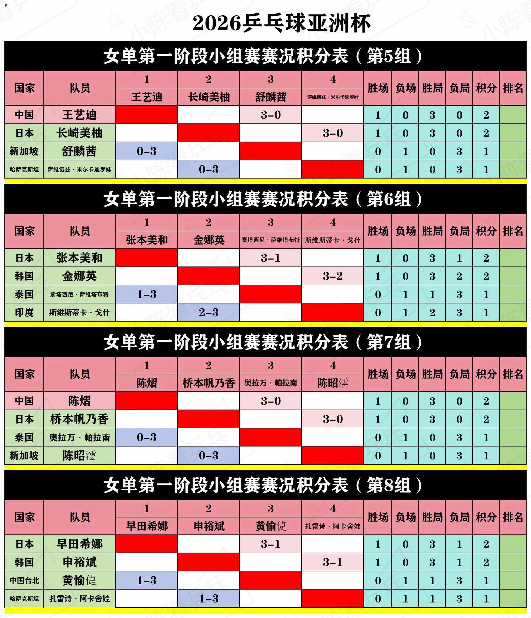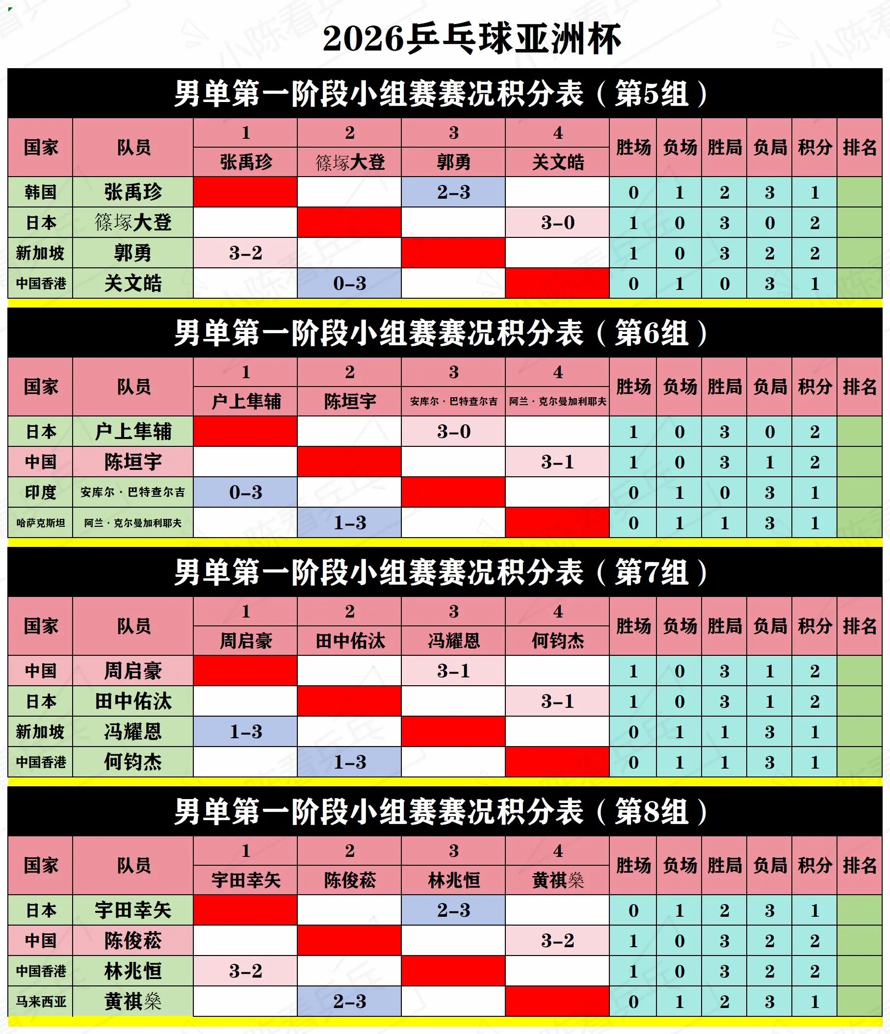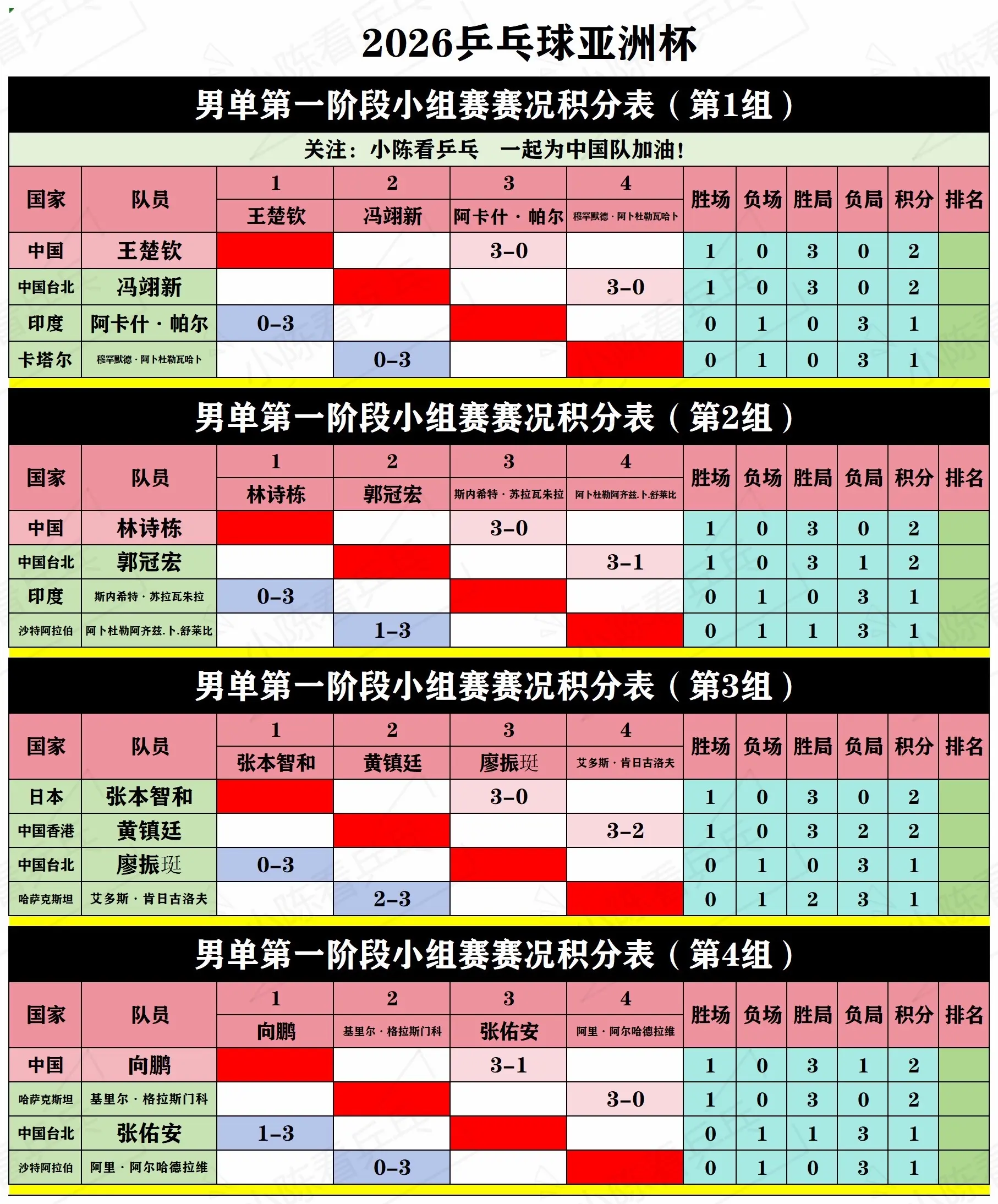 2026乒乓球亚洲杯第1阶段循环赛积分表。2026乒乓球亚洲杯第1阶段循环赛积分表,中国队加油。