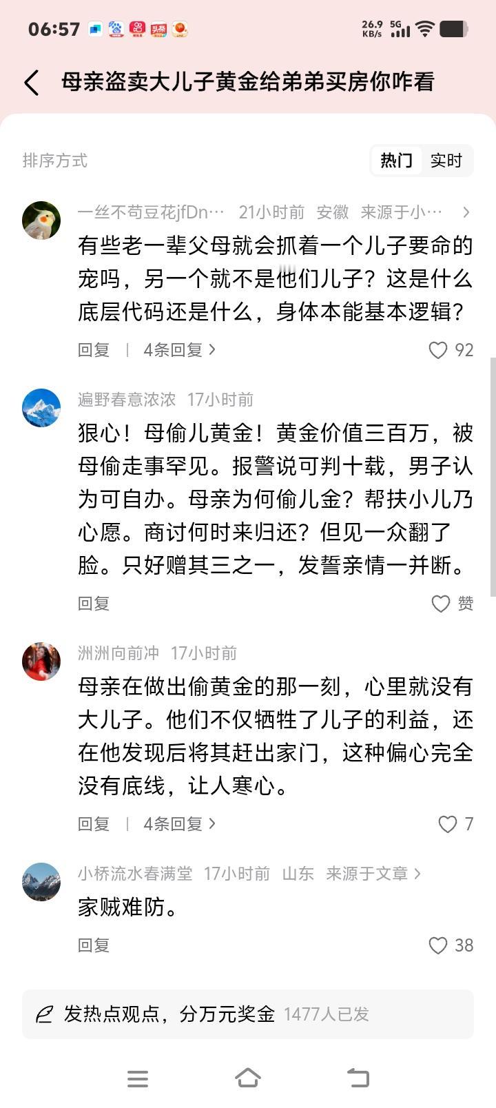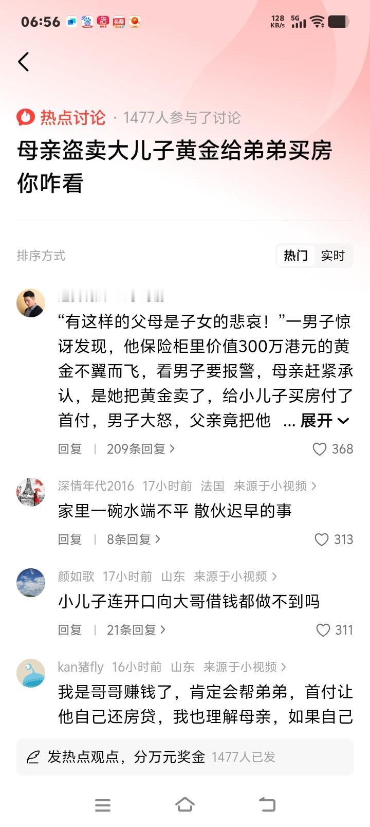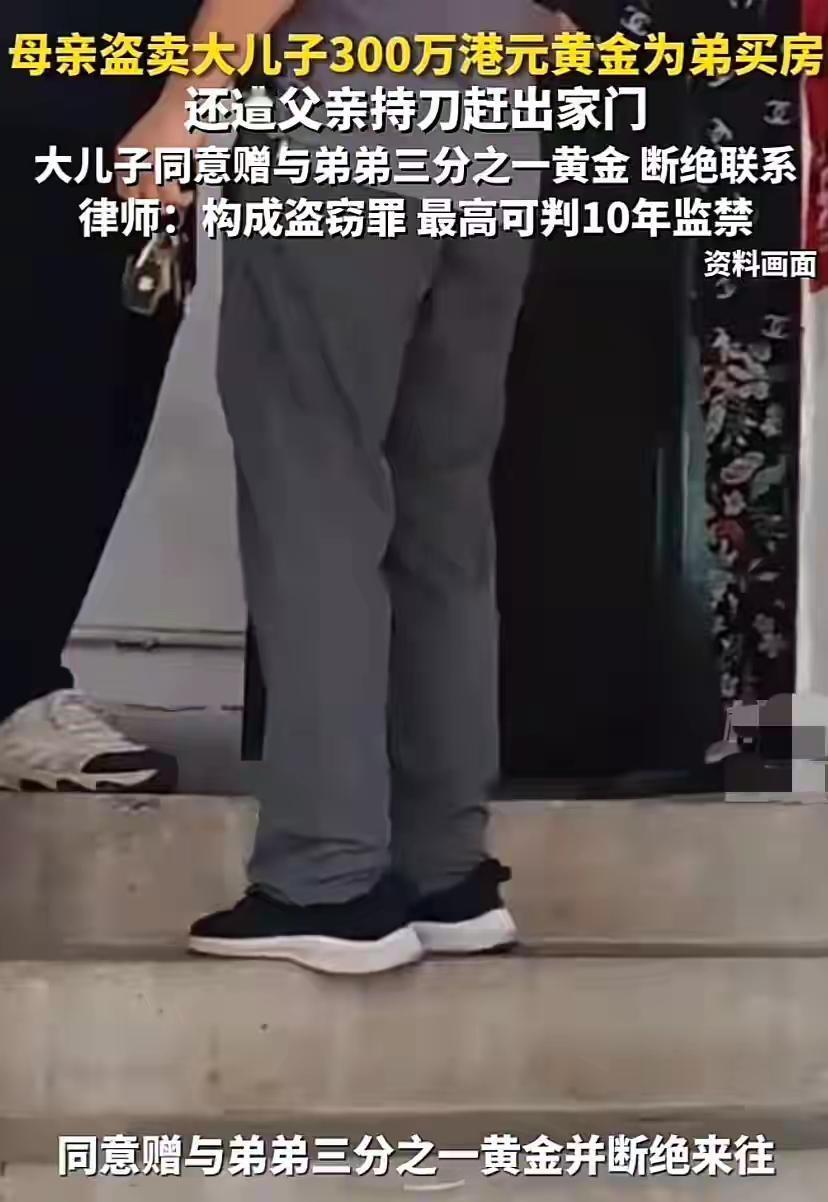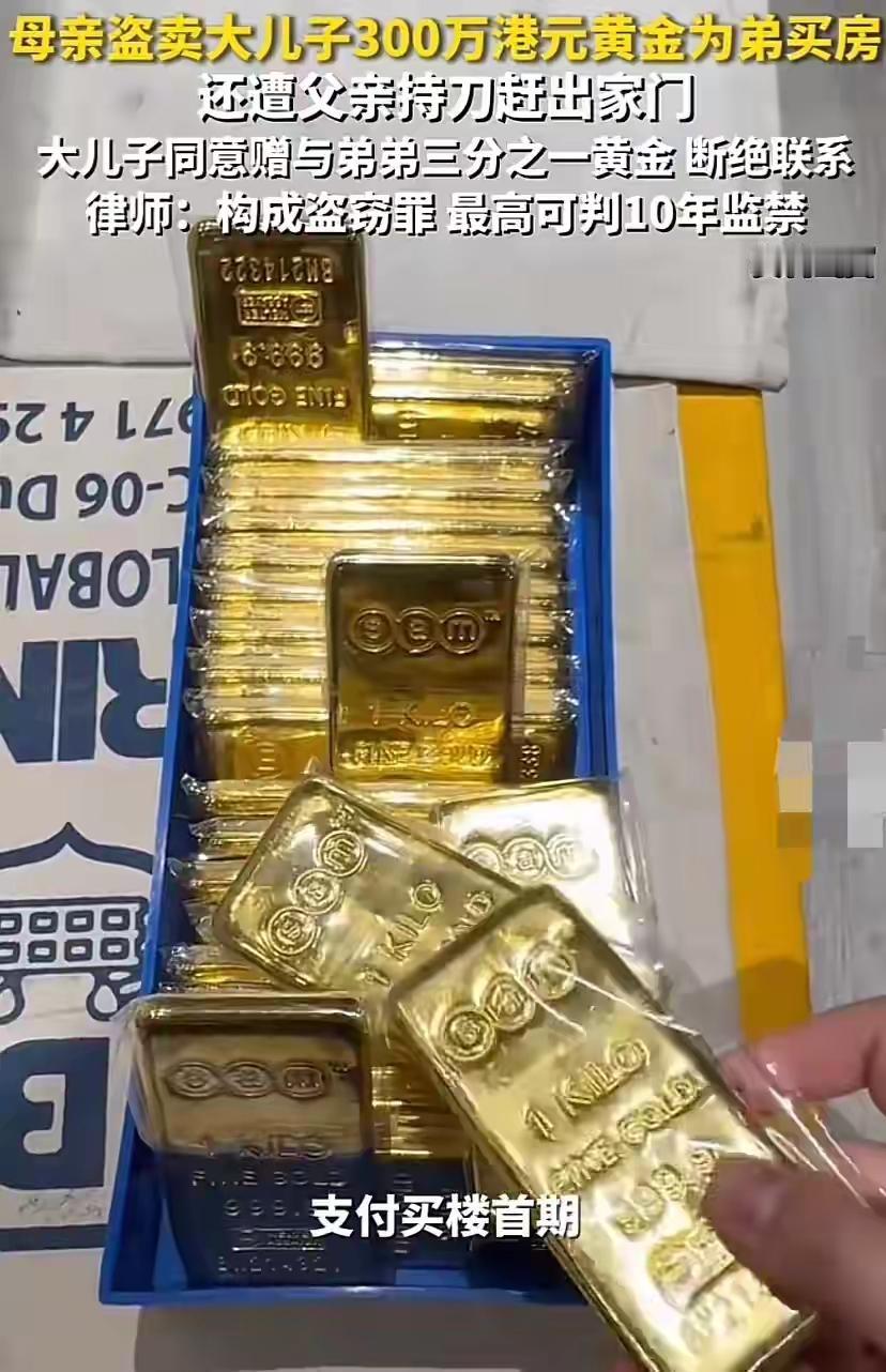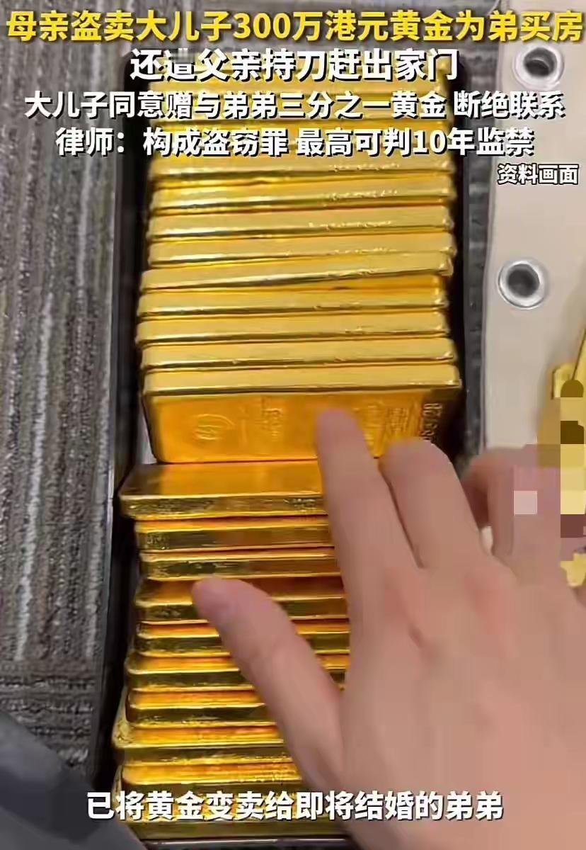 香港男子15年血汗300万黄金被亲妈盗卖,给弟弟买房!父亲持刀赶人,结局全网怒赞:早该这样! 当你打开家中最私密的保险柜,发现里面十五年攒下的全部家当不翼而飞,那种感觉不啻于五雷轰顶。这不是电影情节,而是香港一位男子正在经历的真实噩梦。他视为未来保障、价值三百万港元的黄金,竟被最信任的人洗劫一空。 更令人窒息的是,窃贼不是别人,正是他的亲生母亲。母亲没有丝毫犹豫,将变卖所得全数填进了小儿子购房的首付款里。那一刻,长子半生的勤勉与节俭,在母亲眼中,不过是用来填补另一个儿子人生缺口的“可动用资源”,连一声商量都显得多余。 东窗事发后,这个家庭的反应更是将“偏心”二字演绎到了极致。父亲不仅没有主持公道,反而怒不可遏,用最激烈的方式将受害的长子驱逐出门。而被偏爱的弟弟,在既得利益面前,也只是含糊其辞地表示“可以商量”,全然无视哥哥被掏空的人生规划。 无数网友看到这里,拳头都硬了。这哪里是家庭纠纷?这分明是一场针对老实孩子的“合法抢劫”。亲情的外衣之下,包裹的是对个人财产赤裸裸的侵犯,是对付出者尊严的无情践踏。长子在这个家里,仿佛只是一个没有感情的血汗钱提取机。 然而,这位长子的最终选择,却让所有围观者长舒一口气。他没有选择无限度的忍让,也没有让愤怒冲昏头脑去报警将母亲送入法网。他做出了一个极其清醒又无比痛心的决定:赠与弟弟三分之一的黄金,从此与这个家一刀两断,老死不相往来。 这个决定背后,是彻骨的寒心与巨大的勇气。他割舍了不健康的原生家庭,用一百万买断了后半生的情绪内耗与无尽索取。许多法律人士指出,母亲的行为已涉嫌盗窃罪,数额特别巨大,真追究起来后果严重。长子的“留情”,是给亲情最后的体面。 这件事撕开了中国式家庭里最痛的一道伤疤:资源的不公分配与情感绑架。有多少“懂事”的孩子,被“他是你弟弟”、“都是一家人”这样的话术,一步步逼到角落,牺牲自己的利益去成全那个“会哭的孩子”?偏心父母永远不懂,他们透支的,恰恰是最孝顺的那个孩子的未来与亲情。 家是讲爱的地方,但爱的前提是尊重与公平。当父母亲手将天平彻底打翻,也就亲手拆散了兄弟亲情,逼走了最该养老送终的孩子。这场闹剧没有赢家,父母失去了长子的信任与赡养,弟弟背上了永远的道德债,而长子,则用一场决绝的告别,赢回了自己人生的主导权。 家庭偏心 财产边界