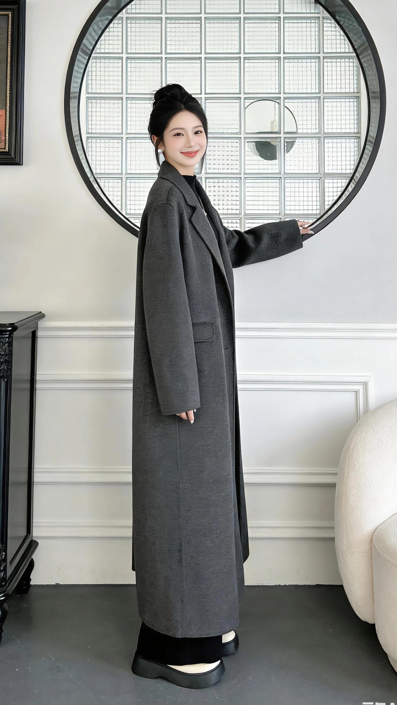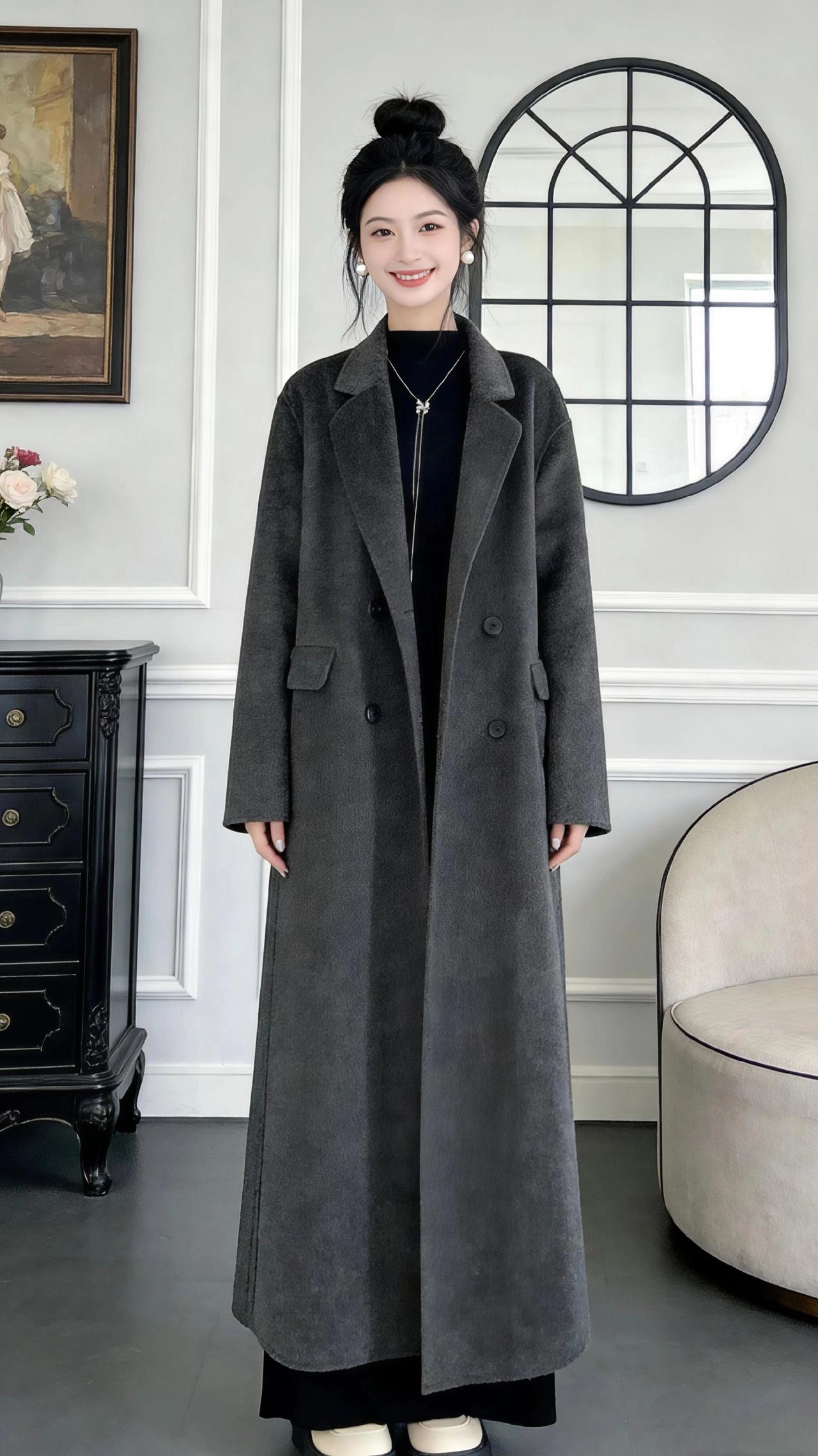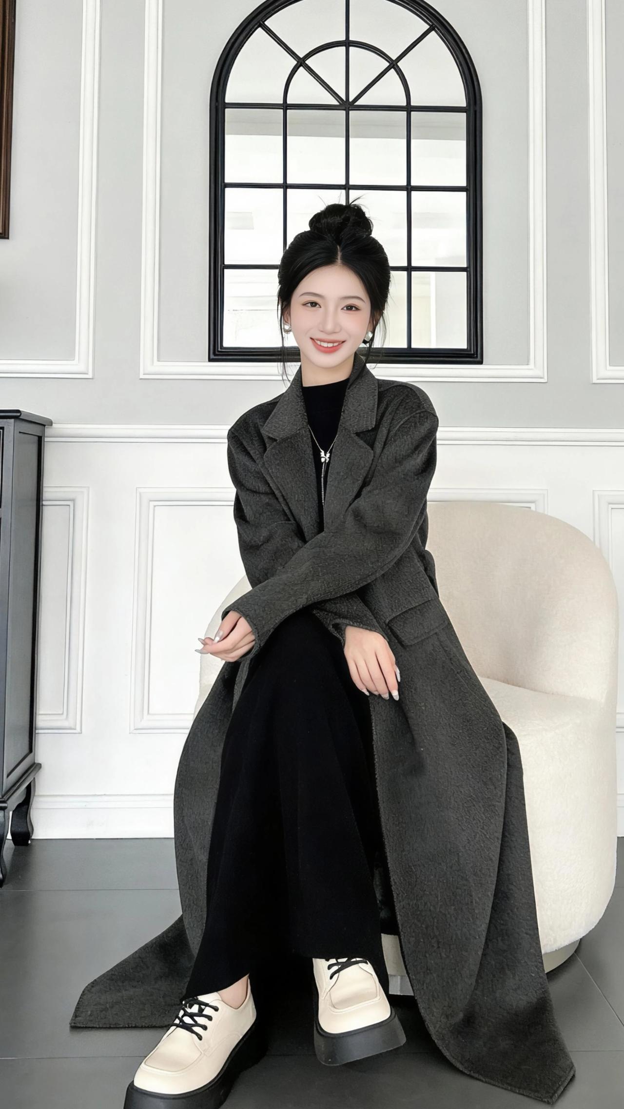 灰呢大衣里的冬日序章 深灰色的大衣垂坠如流动的云,裹住了江南湿冷的风,也裹住了二十岁女孩眼里的星子。她站在浅灰与米白交织的房间里,蓬松丸子头沾着细碎的绒,像檐角未化的雪。 珍珠耳钉在耳尖漾出柔光,与黑柜上盛放的玫瑰遥遥相映。复古书柜里的旧书,浸着经年的墨香,与墙上油画里的仕女一同,静看她转身时大衣下摆扫过深灰地板的弧度。 有时她抬手拢住耳边碎发,袖口掠过镜面的纹路;有时倚着雕花书柜,指尖无意识划过书脊烫金的字母;有时在单人沙发上蜷起腿,大衣像温柔的浪,将她妥帖地拥在其中。 这一身松弛又妥帖的灰,是属于都市女孩的冬日注脚——它不是沉闷的符号,而是将柔软与硬朗、慵懒与精致,都缝进了每一寸羊毛纤维里。当她笑起来时,冷白皮上泛起的浅粉,便成了这片沉静灰调里,最生动的一抹暖色长款大衣 高级感穿搭 新年穿搭 冬季穿搭