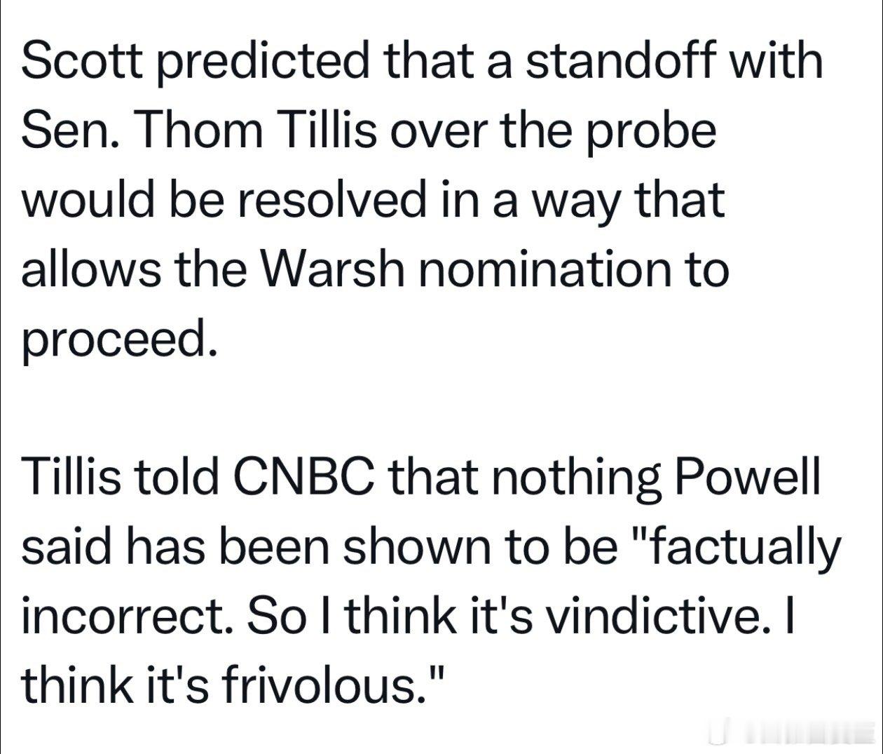 共和党参议员Tillis:美联储主席在国会的证词,陈述事实并没有错误,司法部调查他纯属打击报复…如果不撤诉,我会阻挠新主席提名的确认