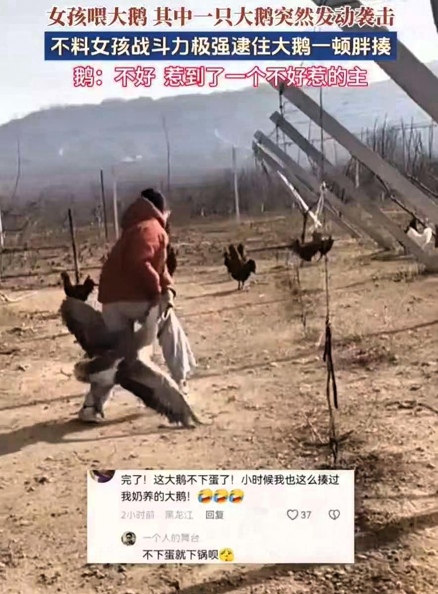 山东,一大学生放假回家,帮家里喂大鹅时,一只大鹅突然对女生发动袭击 女生沉着应对,几下就将其制服,妈妈提议炖鹅,女生表示要先把鹅“教育”服,这一幕朴实又有趣,引来不少网友点赞。 当天下午,女生像往常一样提着饲料去喂鹅,刚把饲料撒进食槽,一只体型较大的鹅突然扑过来,对着她的小腿啄去,裤腿都被啄出了痕迹。面对突然的攻击,女生没有慌乱,反而迅速抓住鹅的翅膀,按住脖颈,将其稳稳按在地上。原本凶猛的大鹅挣扎了几下,很快就没了力气,乖乖趴在地上不再反抗。 妈妈看到这一幕,又好气又好笑,便问女儿要不要把这只凶鹅炖了。女生却笑着拒绝,说等把鹅彻底驯服,让它以后不再乱啄人,再做打算。简单的对话,透着生活里的真实与可爱。 视频传到网上后,网友们纷纷留言,有人感慨山东姑娘的沉稳,有人回忆起自己被家禽“欺负”的经历,更多人则被这朴实的日常逗乐。其实这只是普通家庭的一件小事,却因为真实接地气,戳中了很多人的共鸣。 生活里的小插曲往往最动人,不刻意、不夸张,只是普通人面对突发状况的自然反应,却藏着乐观与从容。这样的日常片段,没有华丽的情节,却最能打动人心。
