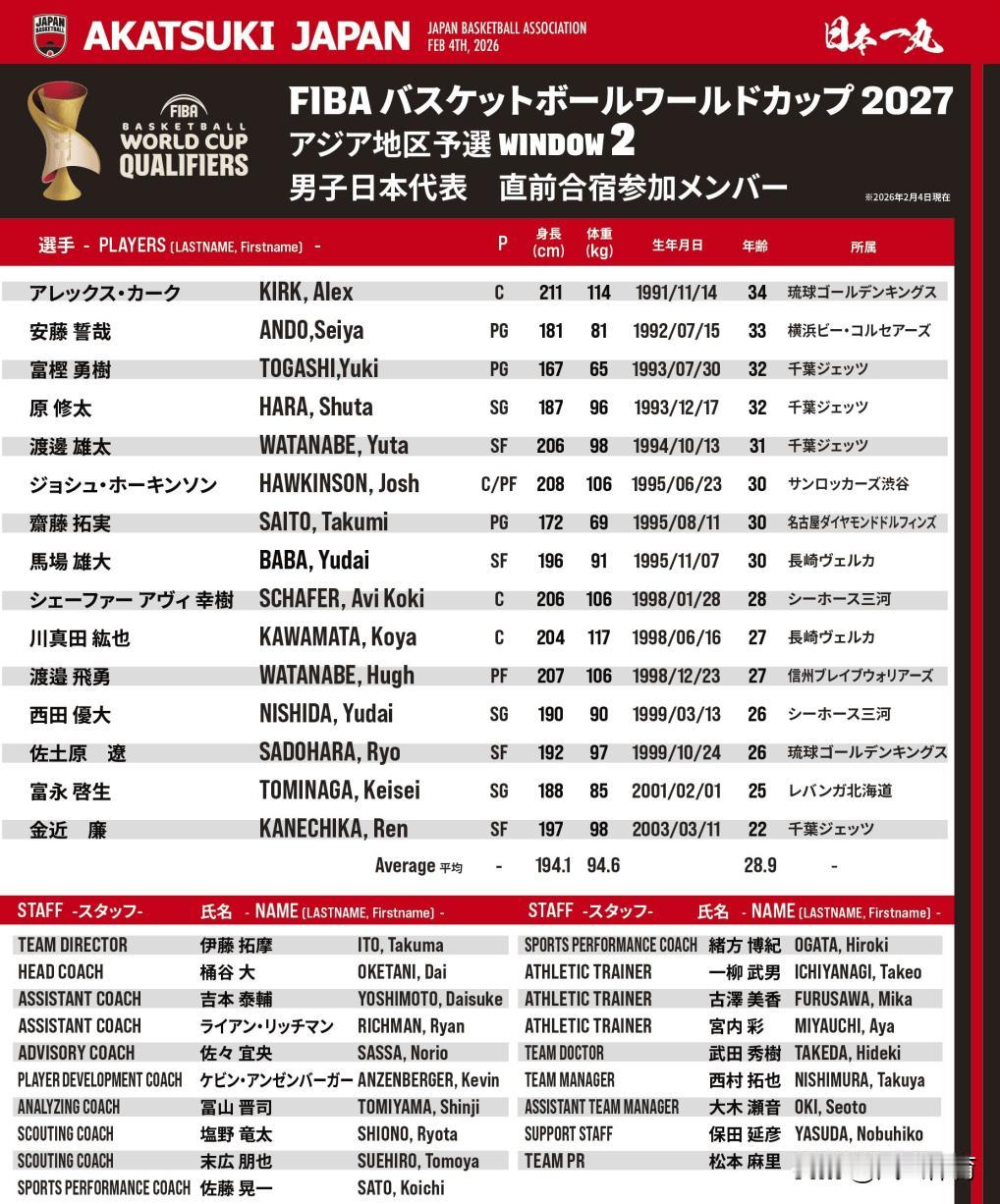 渡边雄太领衔日本男篮集训阵容! 近日,日本篮协正式揭晓了世预赛集训大名单,前NBA球员渡边雄太,以及归化球员霍金森和柯克均在其中。 具体大名单如下: 阿莱克斯 - 柯克、安藤誓哉、富坚勇树、原修太、渡边雄太、霍金森、齐藤拓実、马场雄大、幸树、川真田纮也、渡边飞勇、西田优大、佐土原辽、富永启生、金近廉。 2月2日,曾与八村垒产生矛盾的日本男篮主帅霍瓦斯下课,这意味着八村垒有望重返日本男篮,届时日本男篮实力将大幅提升。据悉,本届日本队平均身高194㎝,与中国男篮相比毫不逊色。所以,在身高不占优势的情况下,中国男篮需有更出色的临场表现。根据赛程,中国男篮将于2月26日客场挑战日本男篮。