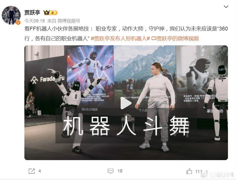 贾老板硬气了,在造了几台车之后,现在又发布了机器人,只是不知道能否量产。这条新赛道确实挺火,估计又能轻松圈个几十亿美元?现在全球汽车行业都显得疲软,加上老龄化问题严重,不知道FF的机器人能不能在护理方面做出点起色来?对了,就算肉身不回国,让机器人回国来看看也不是不行,咋说也有个人形嘛…..贾跃亭发布人形机器人贾跃亭已8年未回国