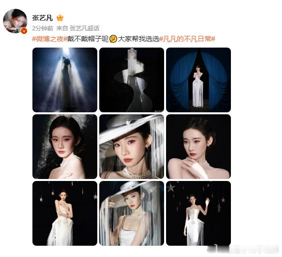 张艺凡大家帮我选一选戴不戴帽子张艺凡珍珠流苏白裙 珍珠流苏白裙衬得张艺凡清冷又温婉,在线纠结戴帽与否,急等网友支招,选出最适配整体造型的搭配。